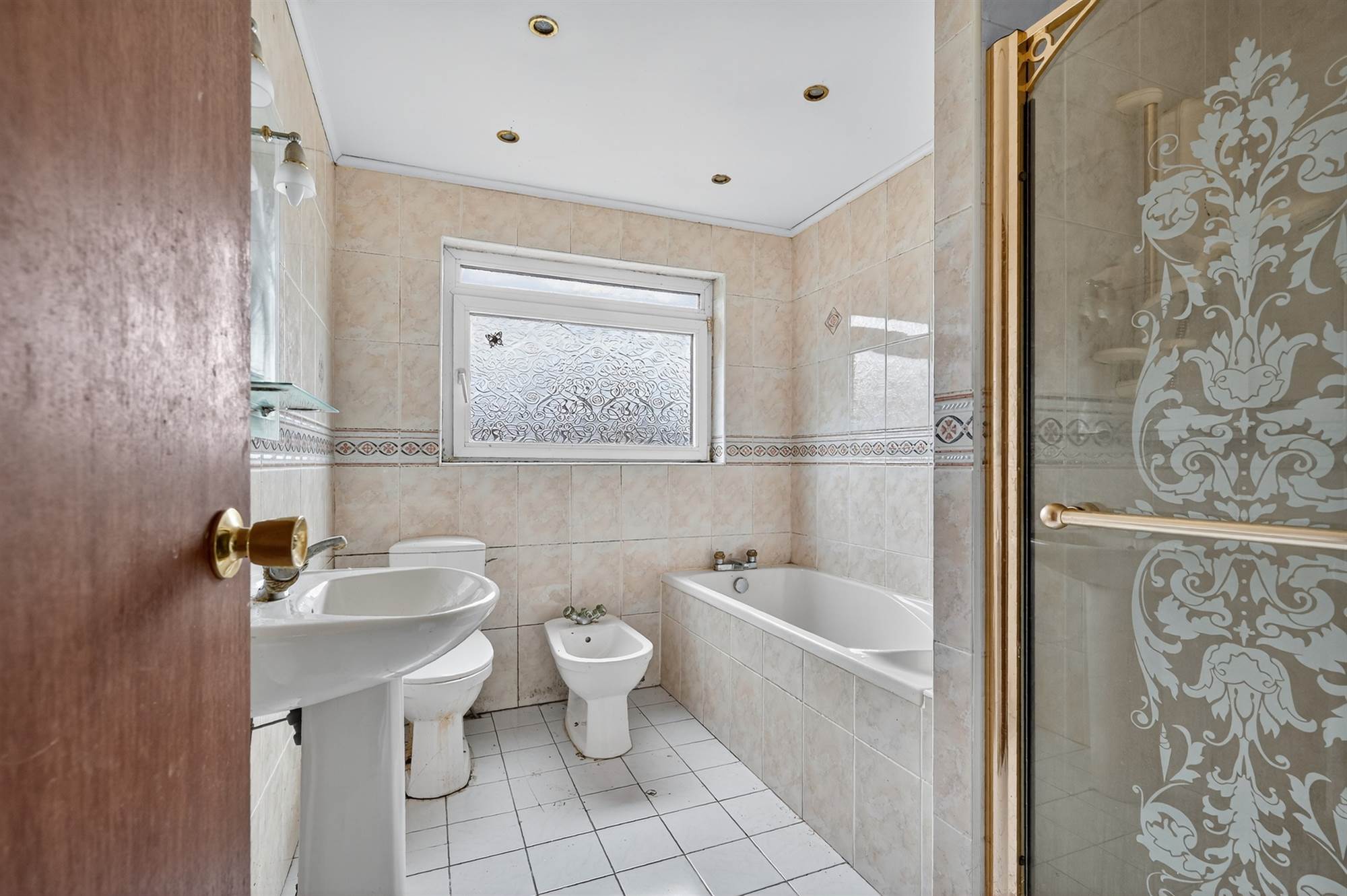 Low flush wc, wash hand basin, bidet, walk-in shower cubicle with electric Mira shower, bath, fully tiled, access to loft.