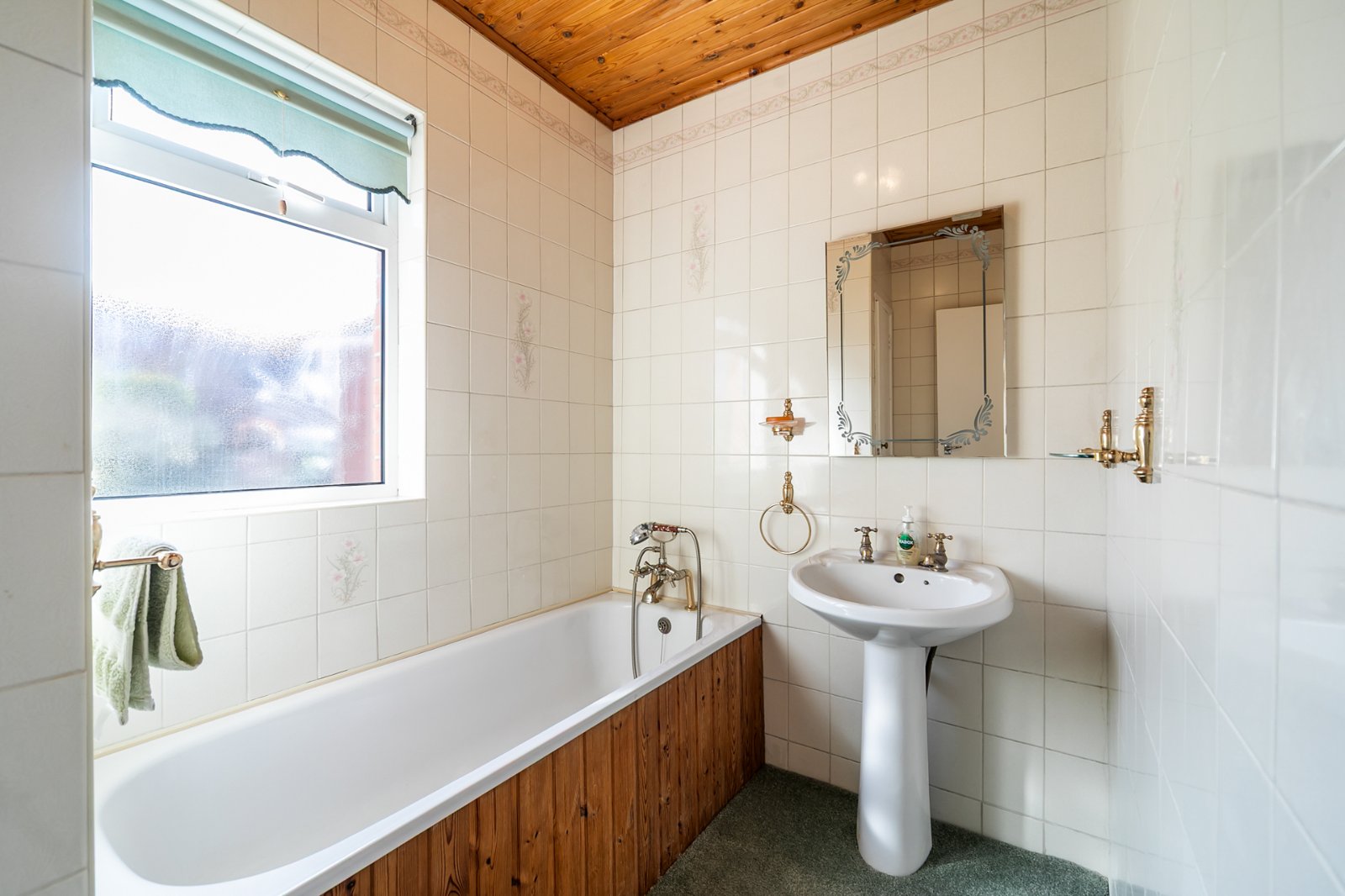 Pedestal wash hand basin, bath with telephone hand shower, fully tiled walls, hotpress