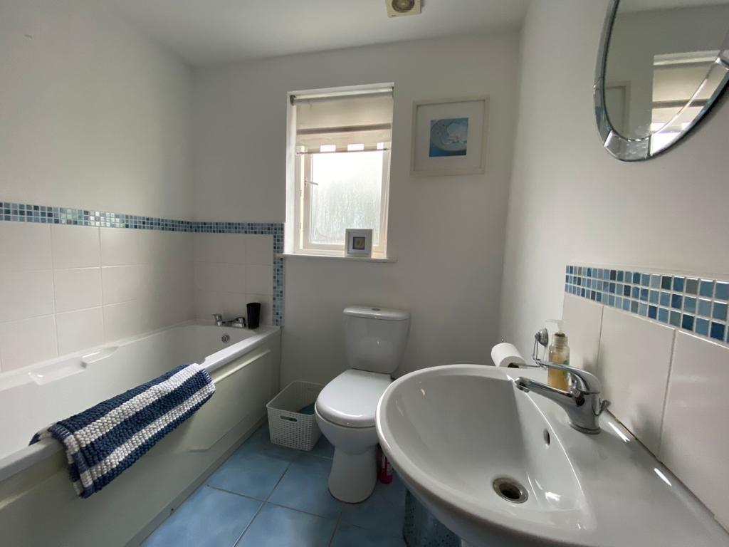 Comprising bath with tiling around, whb and wc, tiled floor.