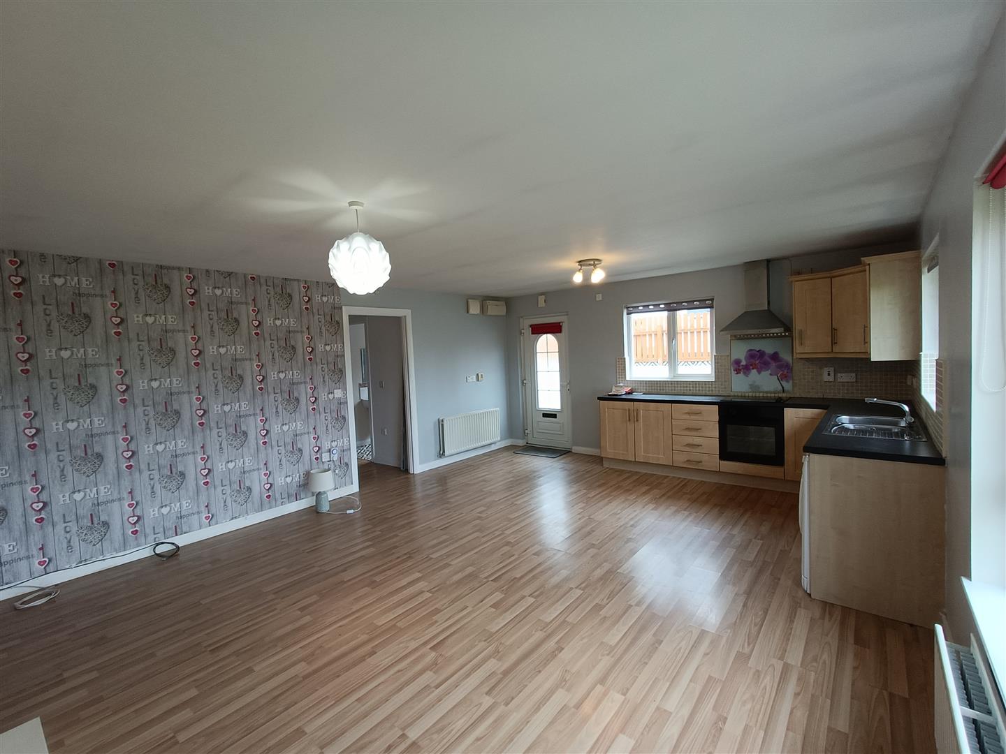 Having eye and low level units, tiling between units, 1 1/2 bowl stainless steel sink unit with mixer taps, hob, underoven, stainless steel extractor hood, plumbed for washing machine, space for fridge / freezer, laminated wooden floor.
