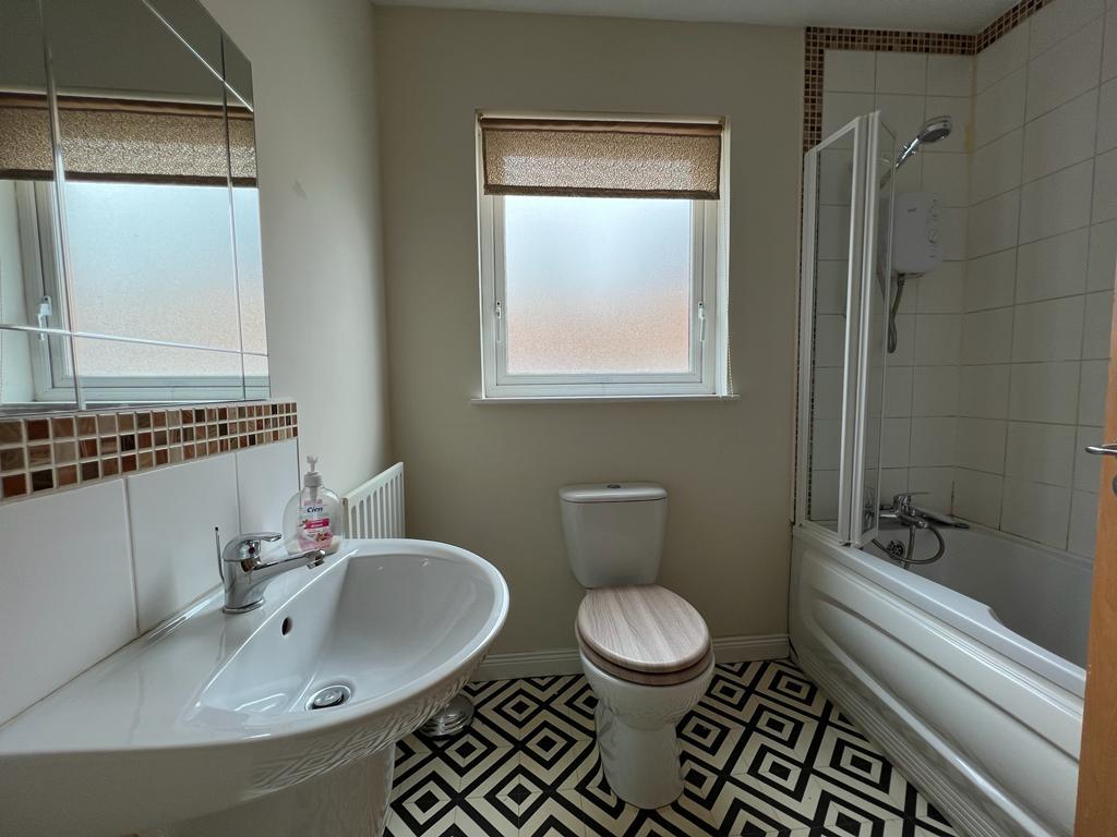 Comprising bath with shower over and tiling around, shower screen, whb and wc.