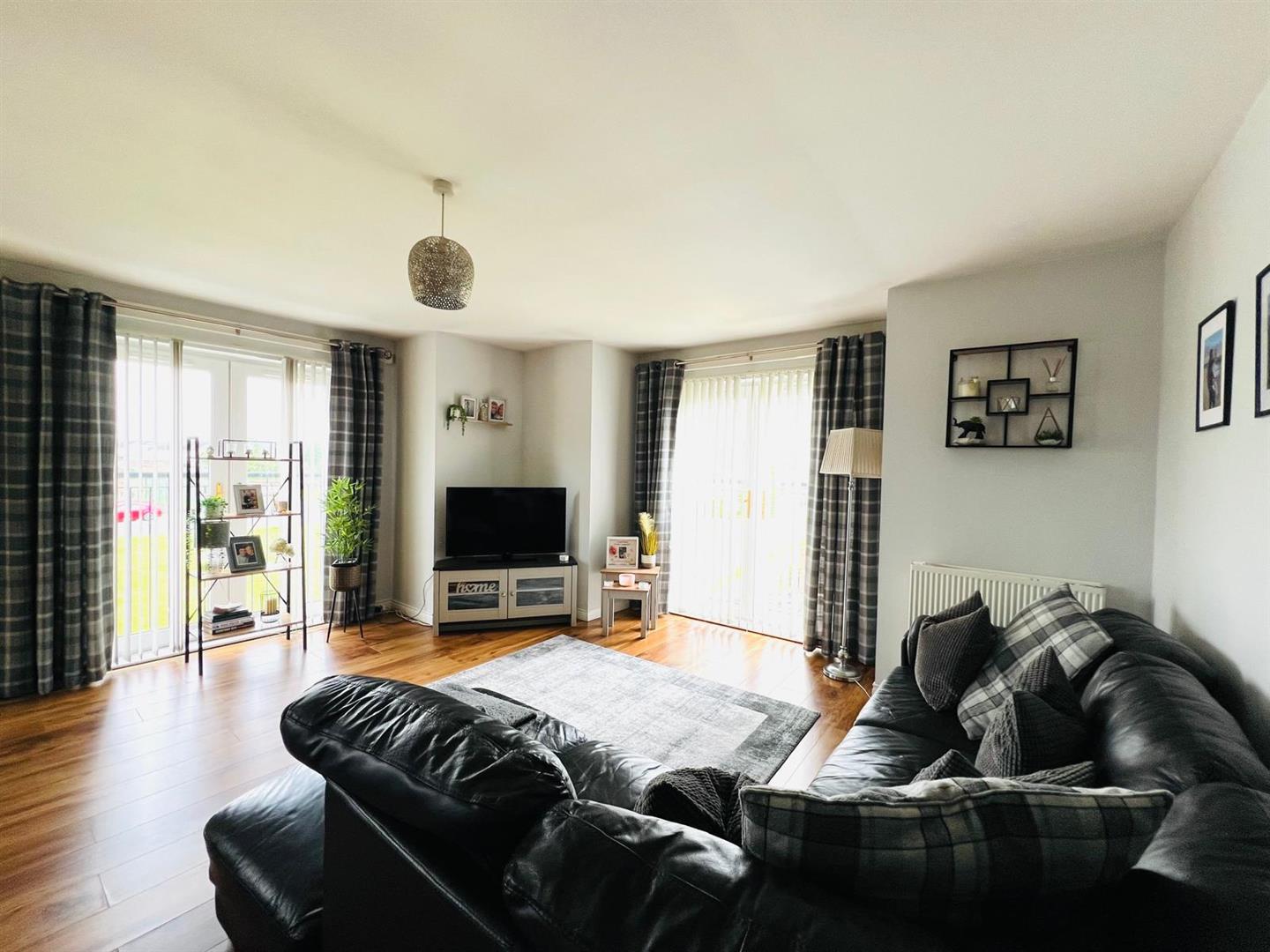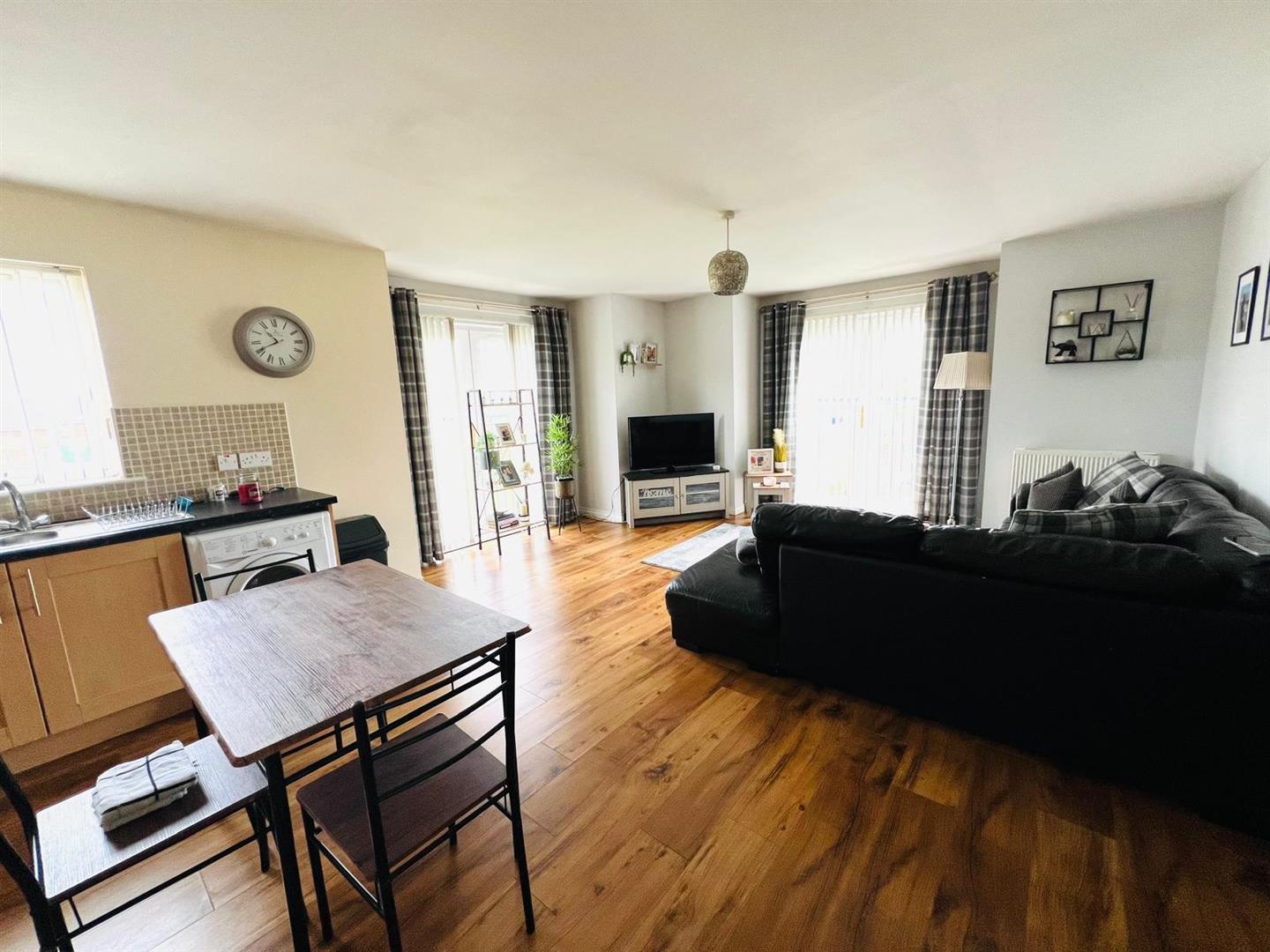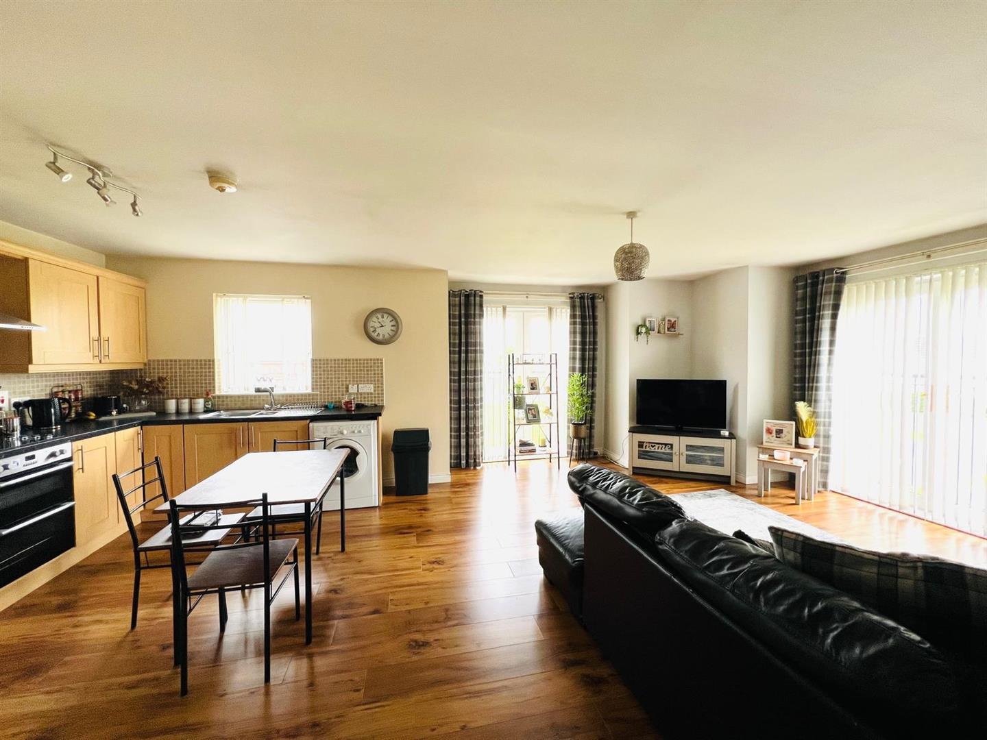Living area having 2 sets of French doors leading to Juliet balcony. Kitchen area having eye and low level units, single drainer stainless steel sink unit with mixer taps, hob, under oven, stainless steel extractor hood, plumbed for washing machine, laminated wooden floor, Dining space.