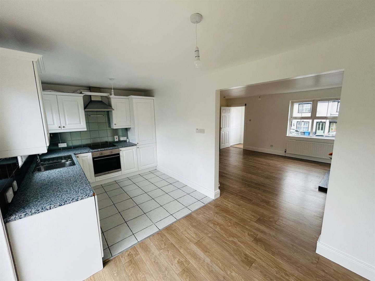 Having range of eye and low level units, tiling between units, 1 1/2 bowl stainless steel sink unit with mixer taps, hob, underoven, stainless steel extractor hood, integrated fridge / freezer, plumbed for washing machine, tiled floor in kitchen area, laminated wooden floor in dining area, patio doors.