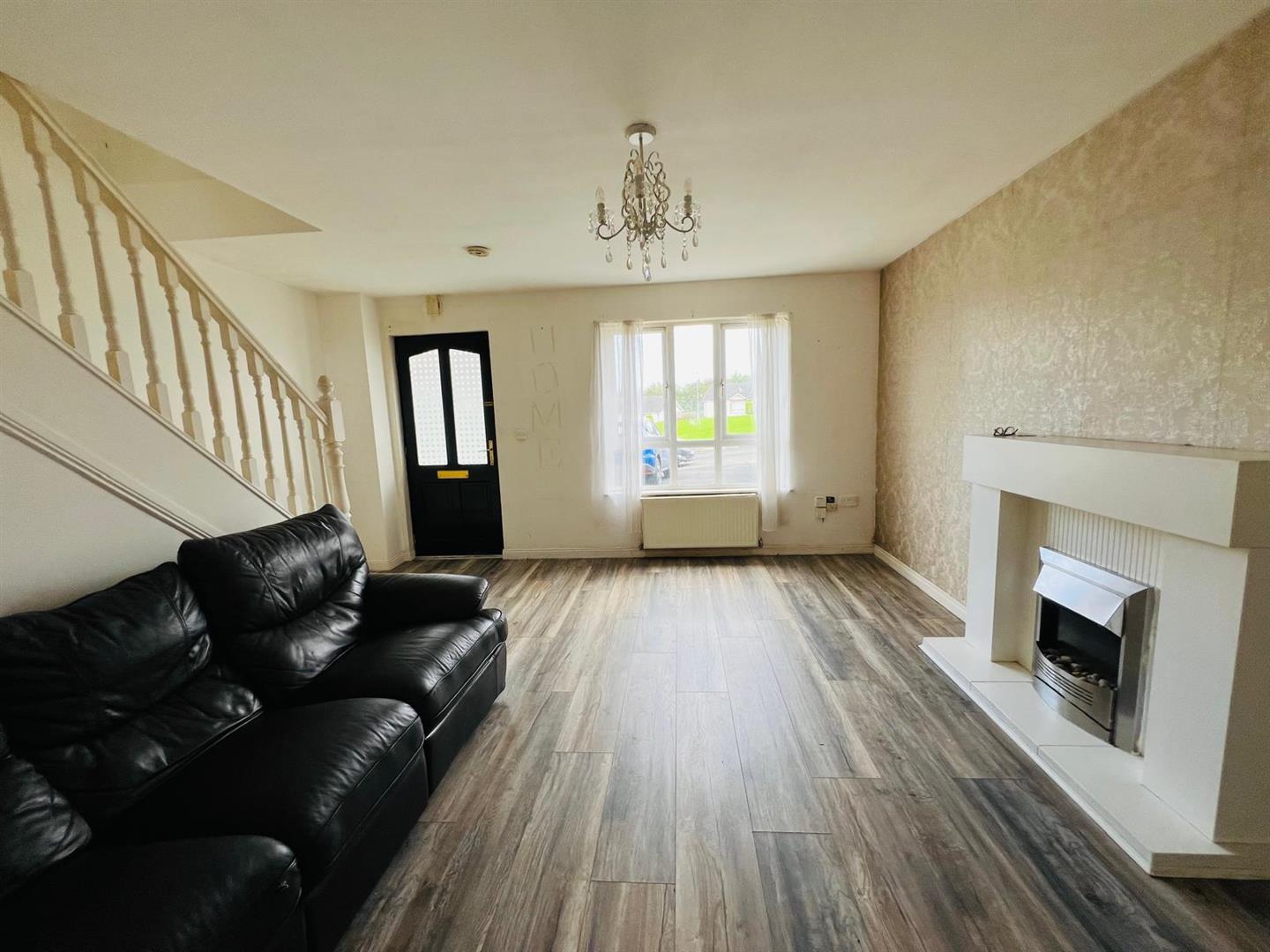Having ornamental fireplace and laminated wooden floor.