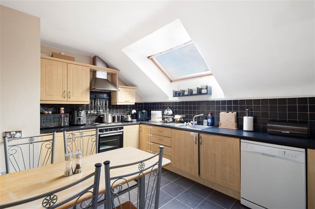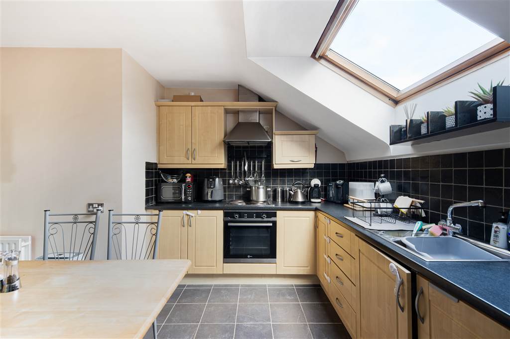 Excellent range of high and low level units, Formica work surfaces, stainless steel sink unit with mixer taps, 4 ring ceramic hob & stainless steel extractor fan, built in oven, plumbed for dishwasher, fridge /freezer space, ceramic tiled flooring, double panelled radiator, Velux roof light, space for dining.