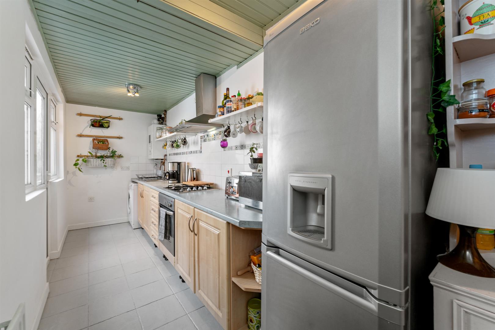 Range of high and low level units, granite effect work surfaces, inset single drainer stainless steel sink unit, built in under oven, gas hob, stainless steel extractor hood, plumbed for washing machine, part tiled walls, ceramic tiled floor, gas fired boiler, timber panelled ceiling.