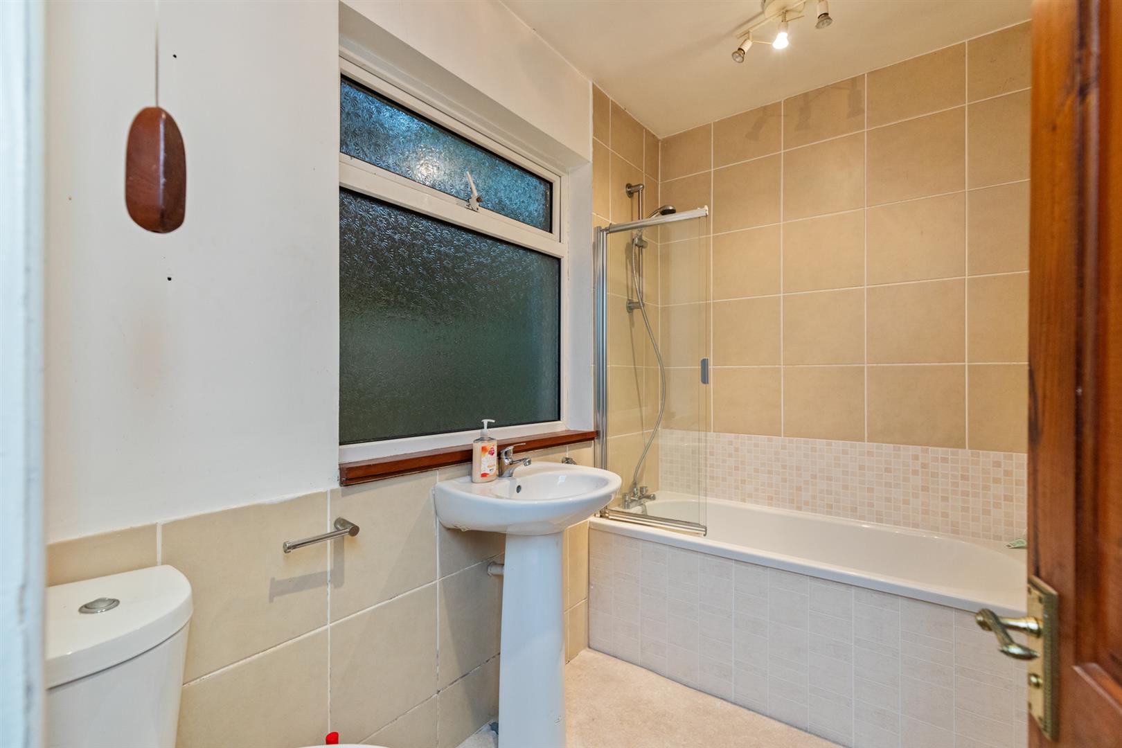 White suite comprising: Low flush WC, pedestal wash hand basin with mixer taps, panelled bath with mixer taps, shower over bath and shower screen, part tiled walls.
