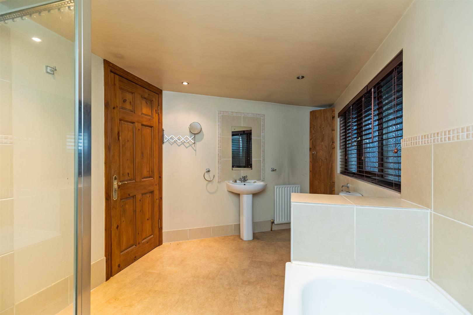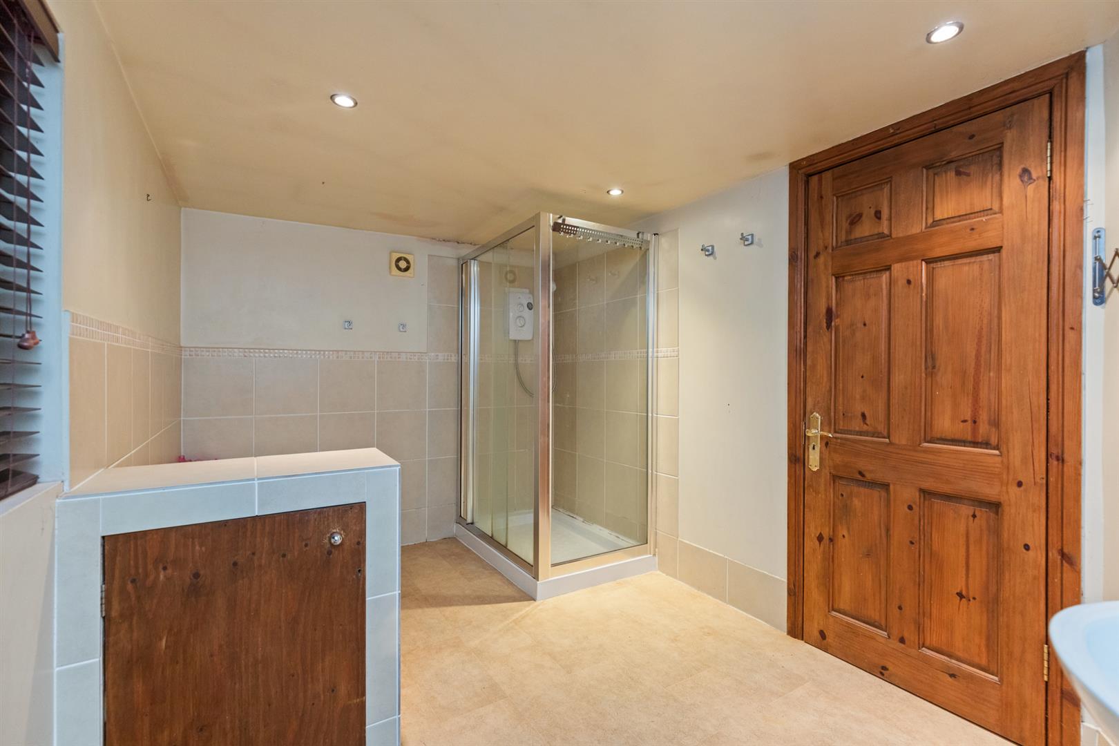 White suite comprising: low flush WC, pedestal wash hand basin with mixer taps and tiled splashback, panelled bath with mixer taps, walk in shower cubicle with electric shower unit and sliding shower door, recessed spotlighting, extractor fan.