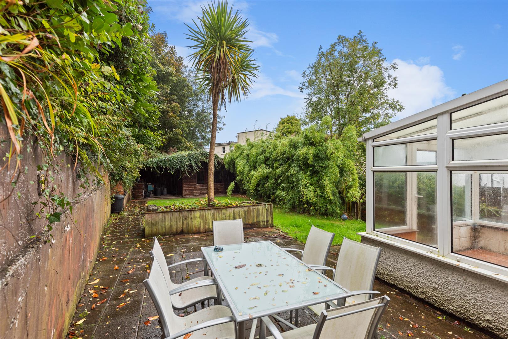 Enclosed rear garden with paved area and area in lawn.