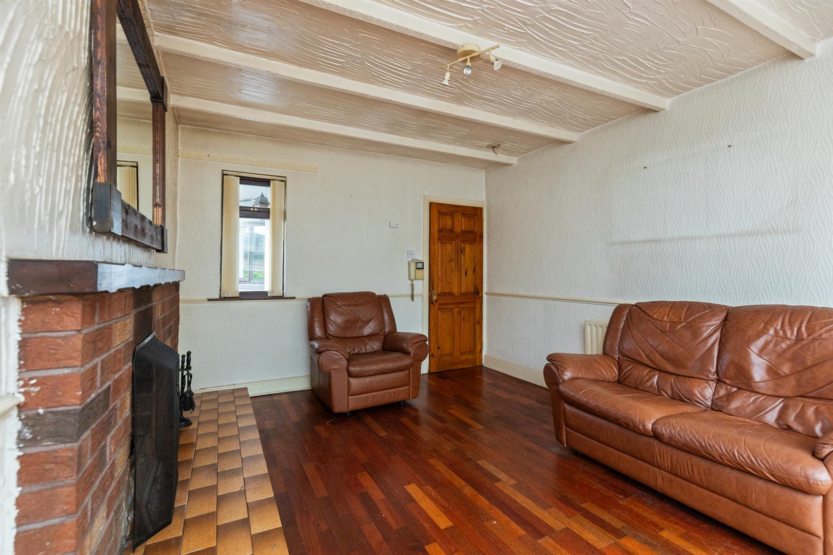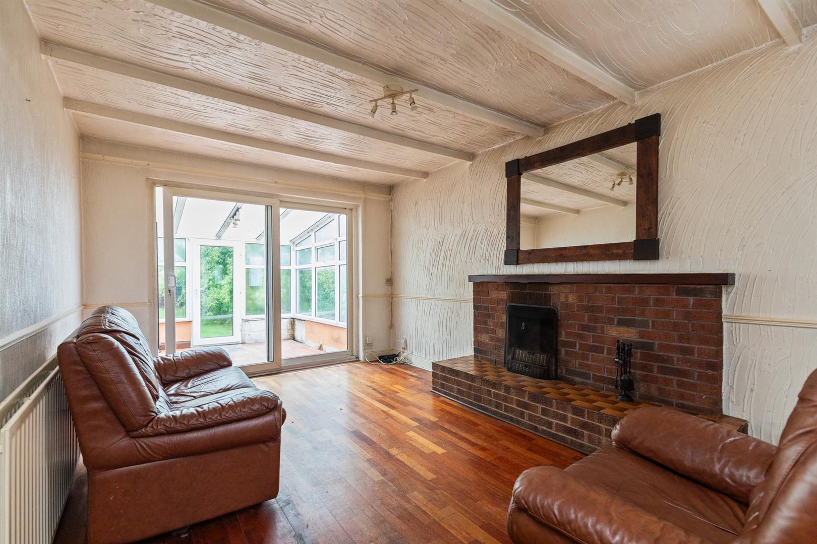 Solid wood flooring, Belfast brick hearth with wooden mantle, access to conservatory.
