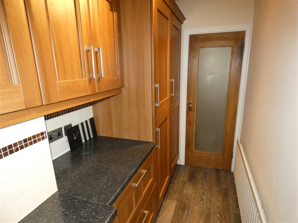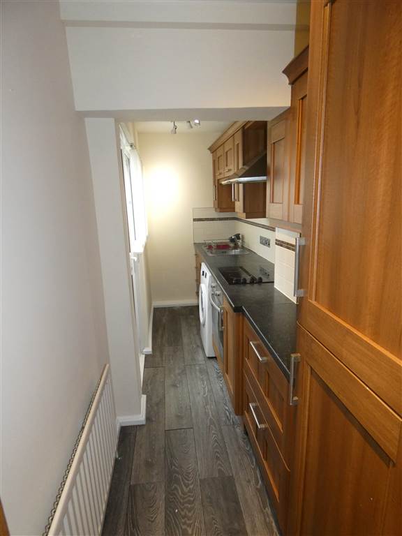 Range of high & low level units, single drainer stainless steel sink unit with mixer tap, underbench stainless steel oven with 4 ring electric hob and matching extractor hood over, plumbed for washing machine, integrated fridge/freezer, laminate timber effect flooring, partially tiled walls, Upvc double glazed door to rear.