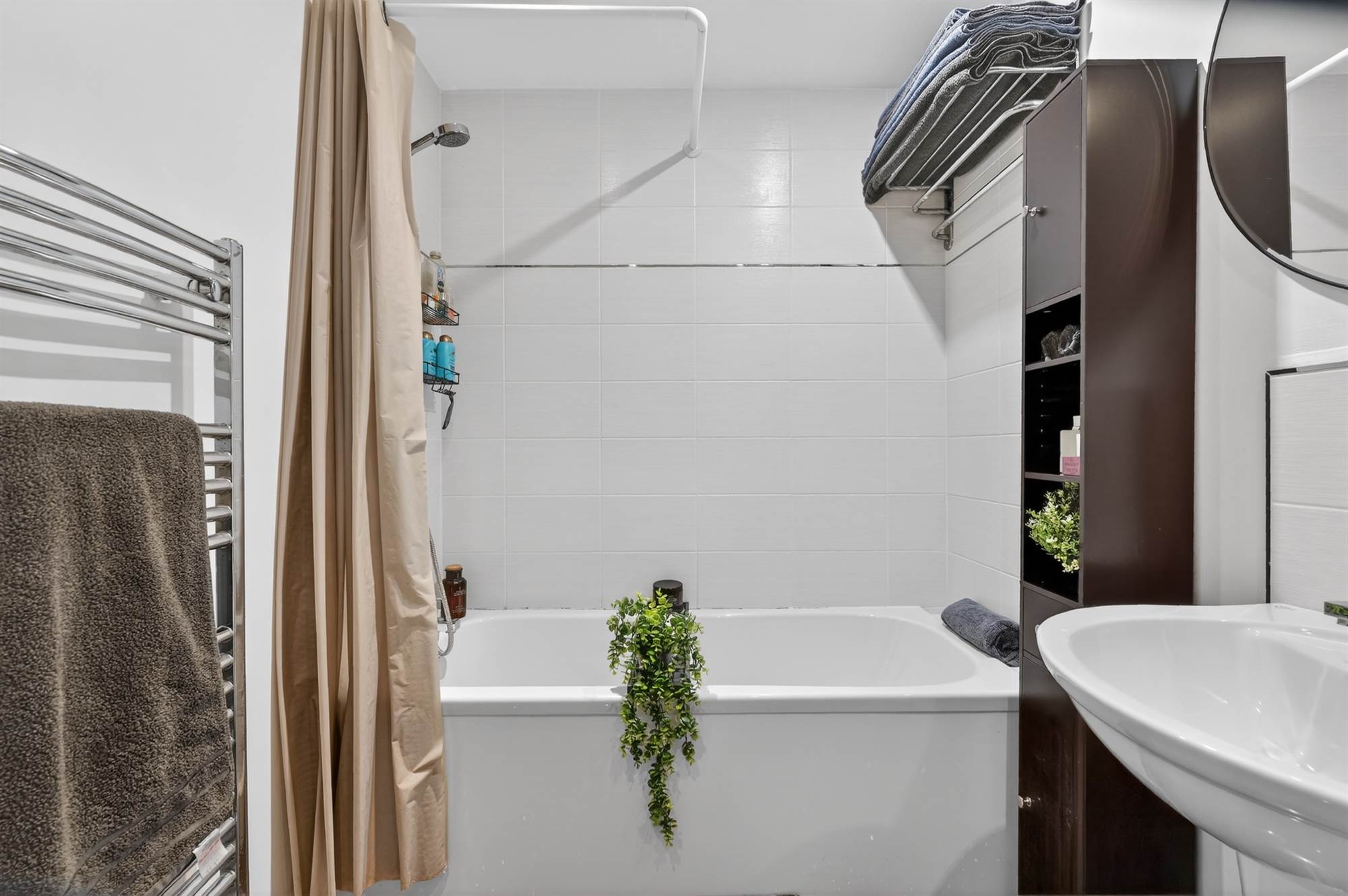 White suite comprising low flush wc, half pedestal wash hand basin, panelled bath with mixer tap and telephone hand shower, chrome heated towel rail, tiled floor, part tiled walls.