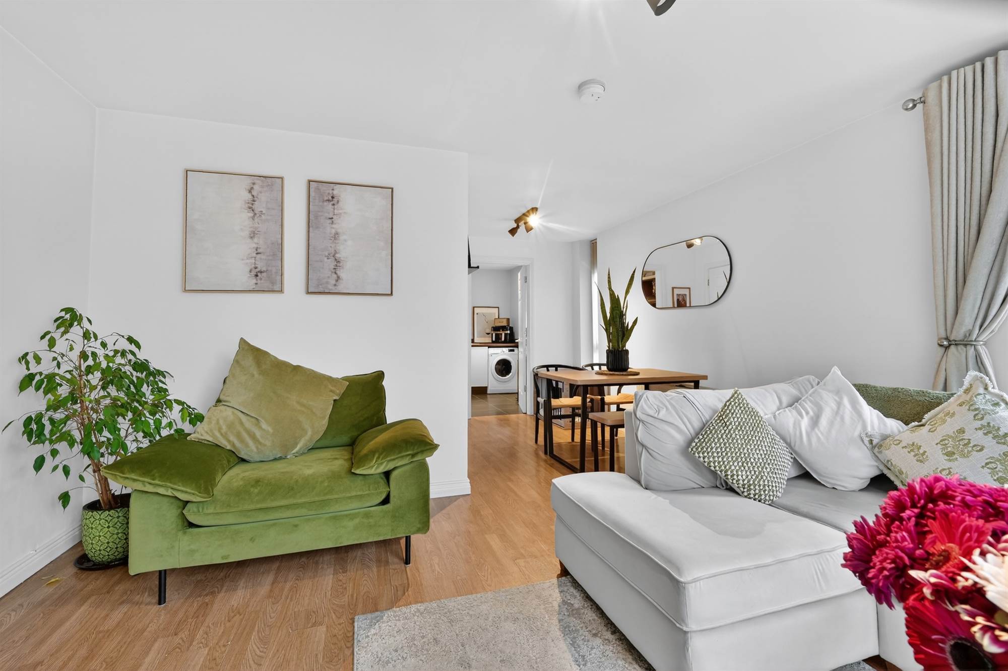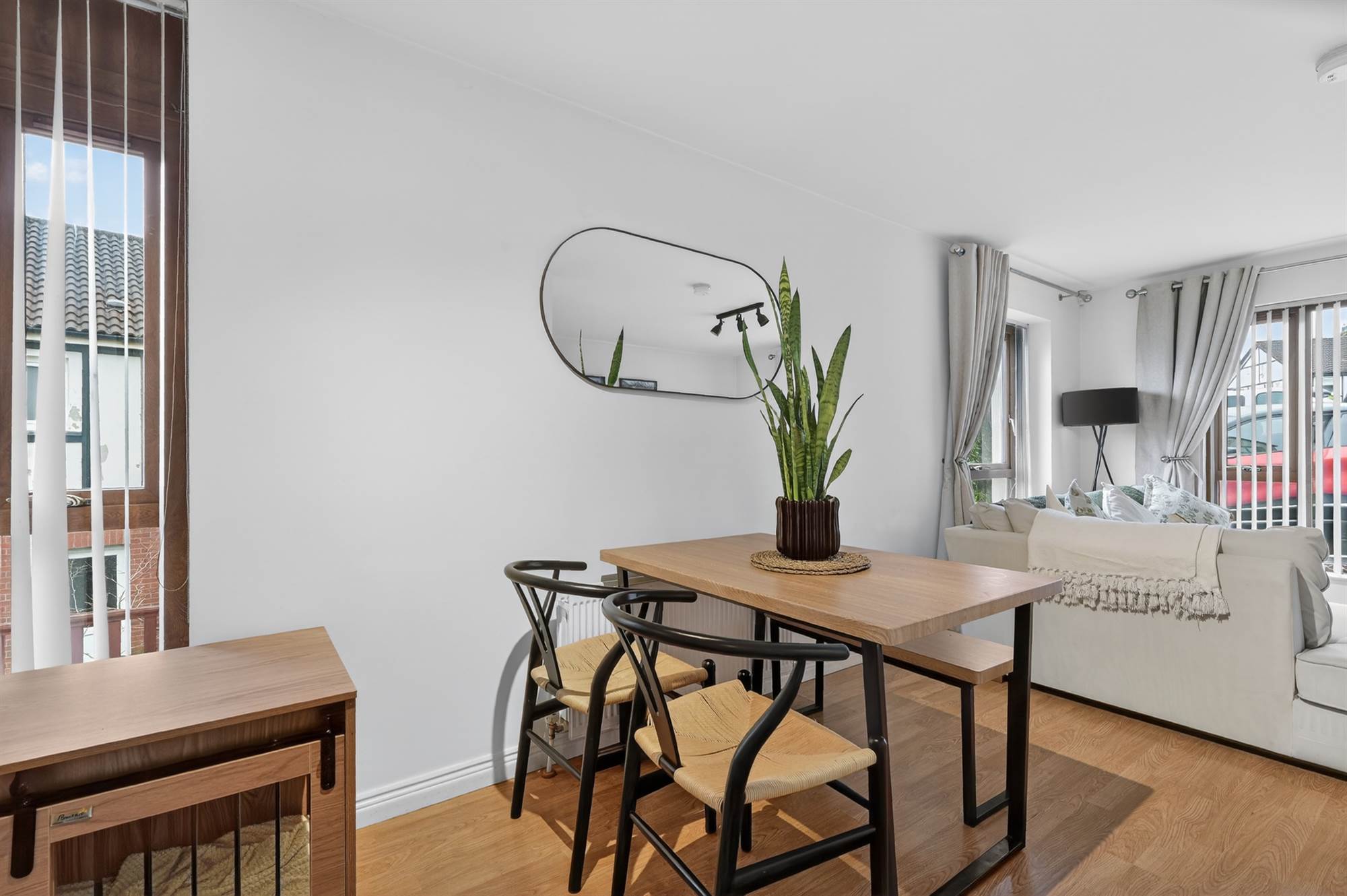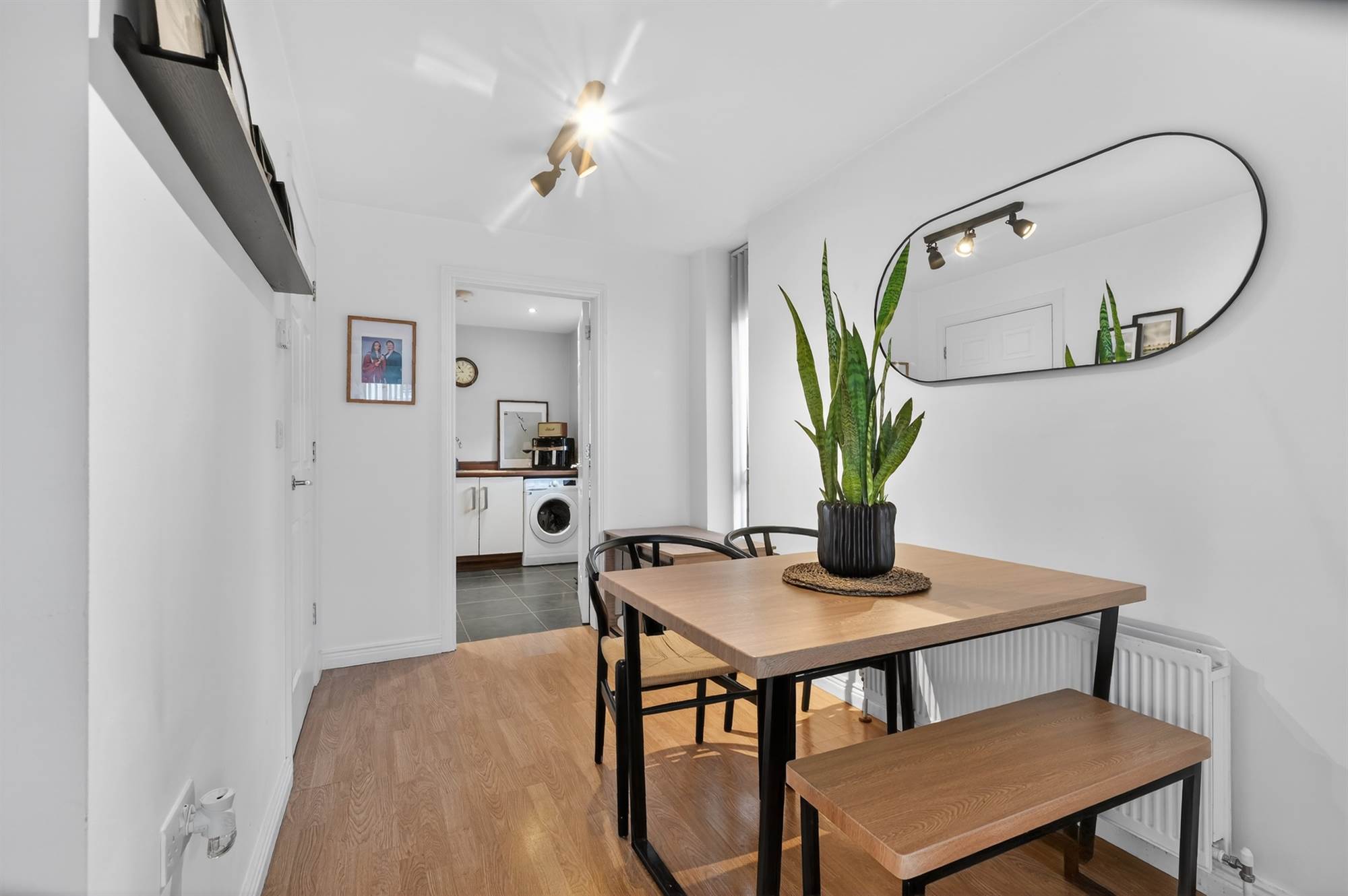 Laminate wood effect floor, casual dining area.