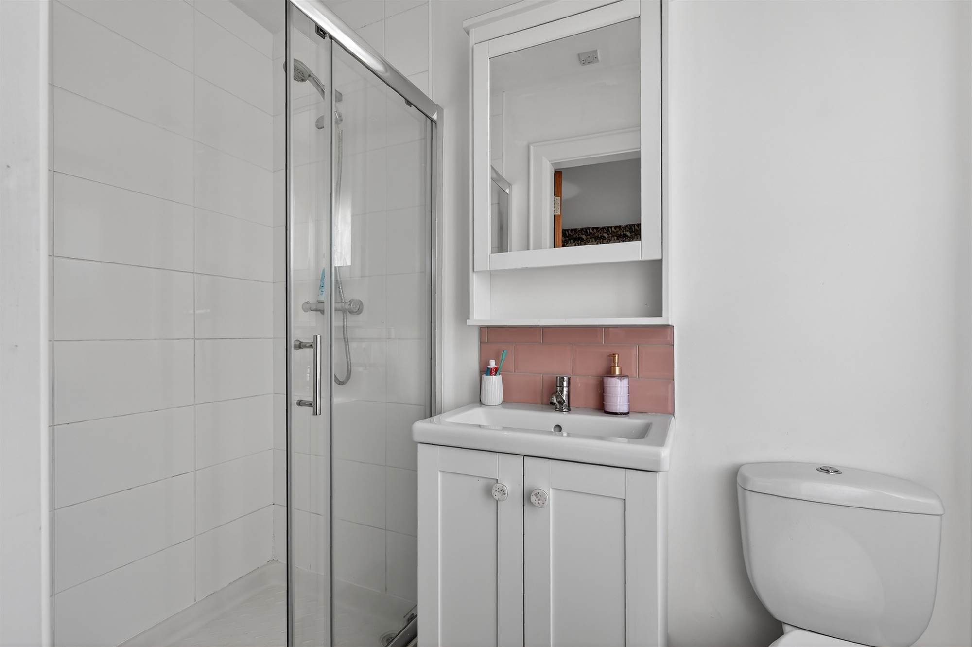 White suite comprising dual flush wc, vanity unit with ceramic sink and mixer tap, splashback. Double shower cubicle with thermostatic shower. Part tiled walls. Tiled floor.