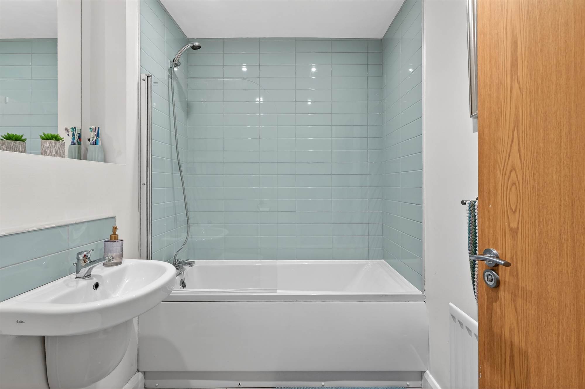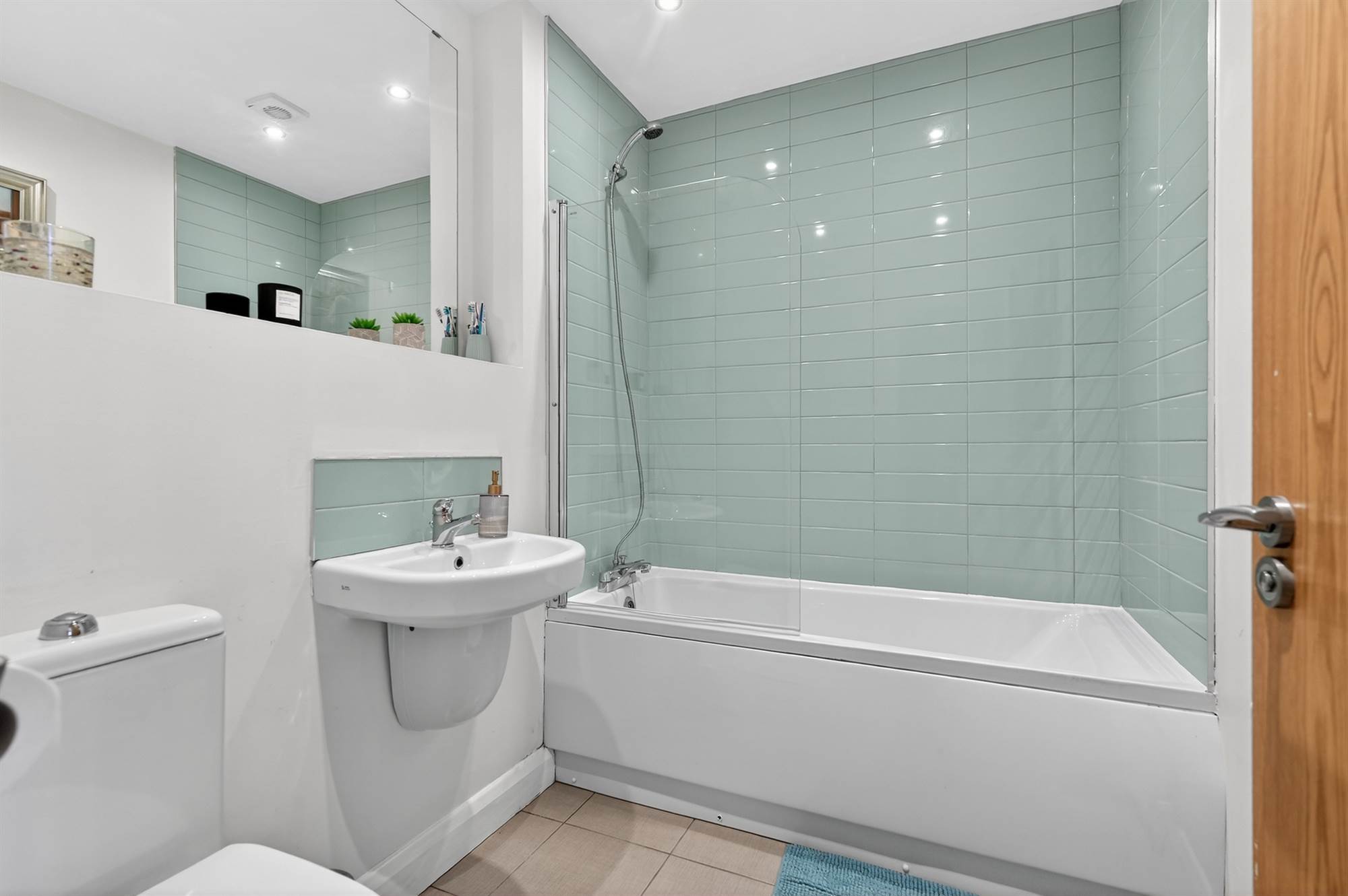 White suite comprising dual flush wc, floating was hand basin with mixer tap. Panelled bath with mixer tap, shower and glass screen. Wall-mounted mirror. Tiled walls, tiled flooring, spotlights.