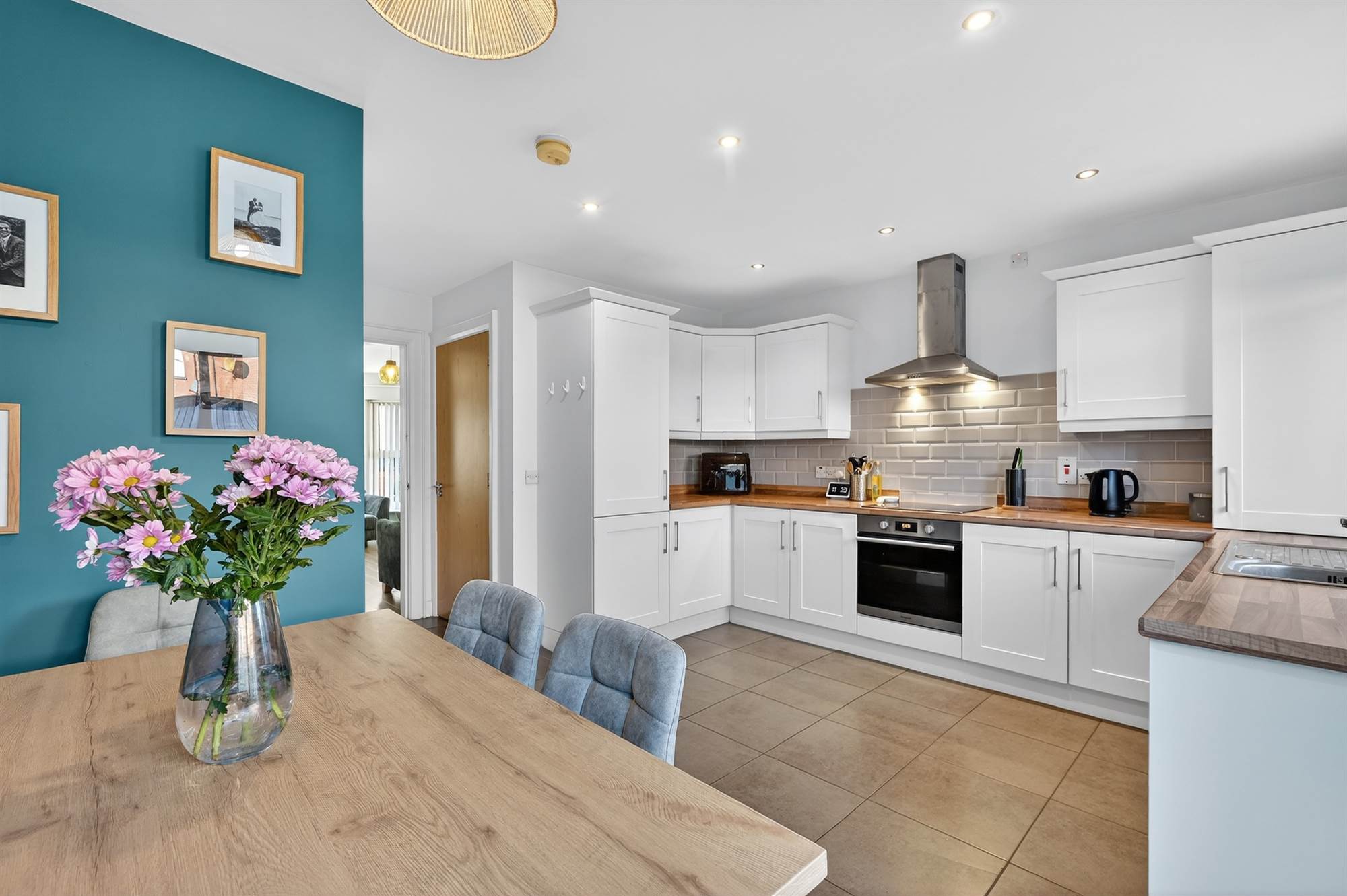 Modern range of high and low level units, work surfaces, stainless steel single sink unit with mixer tap, underbench oven, four ring hob, extractor fan, integrated fridge/freezer, integrated dishwasher, tiled splashback. Housing for gas boiler, tiled flooring. Casual dining area. Sliding glazed doors to rear.