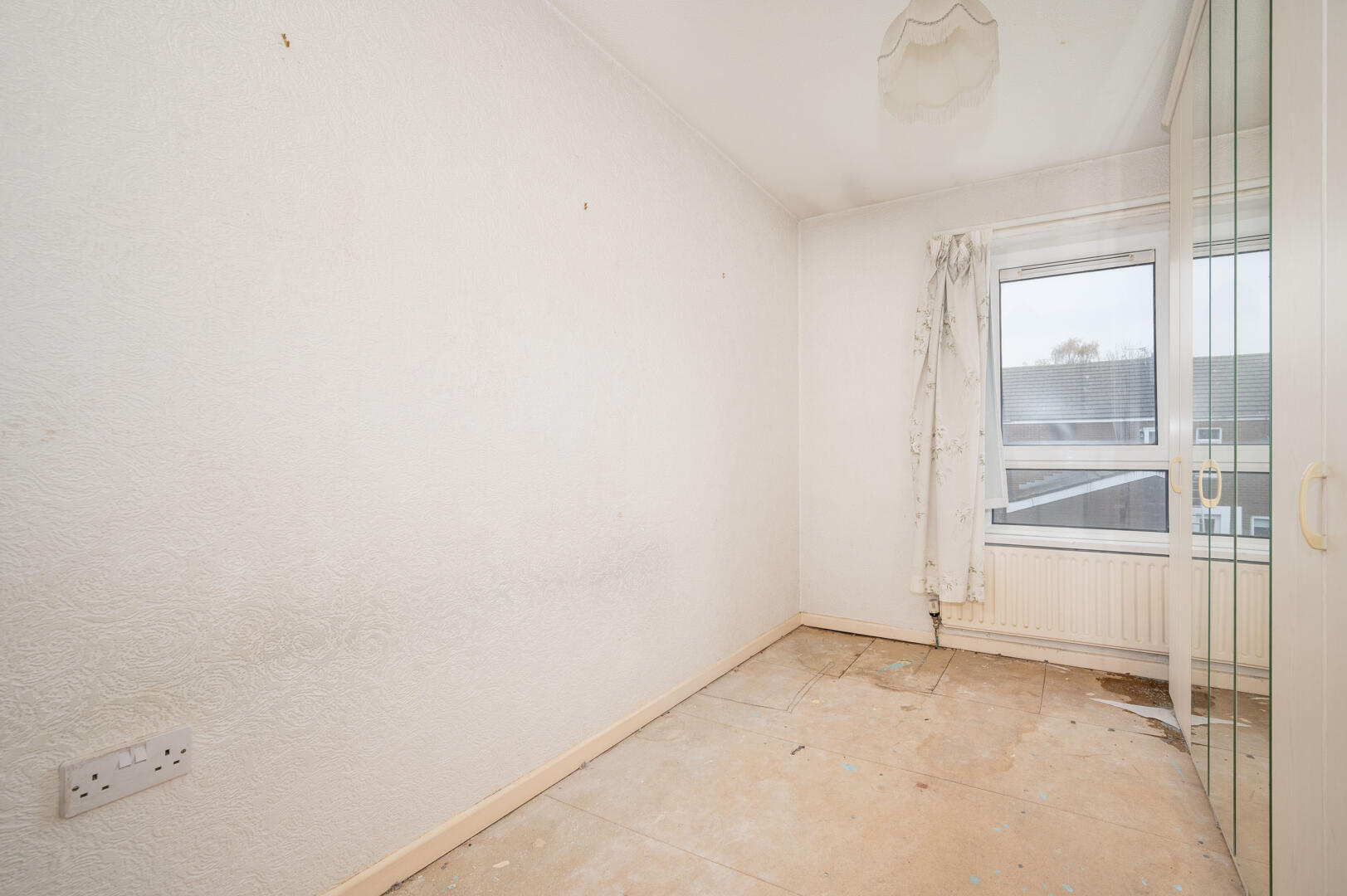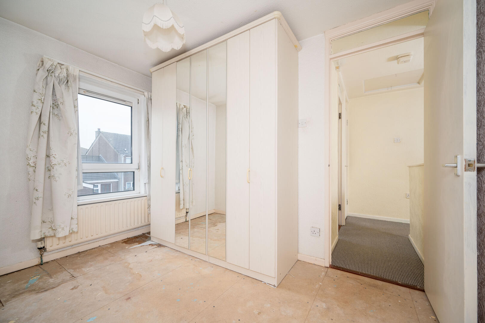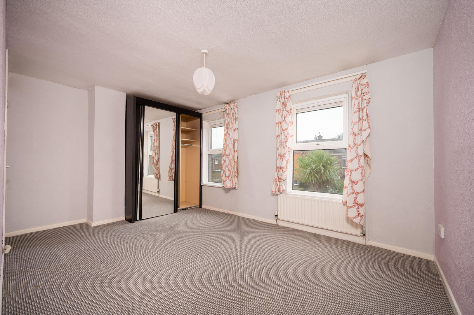 Upstairs, there are two well-proportioned bedrooms, including a main bedroom with dual aspect windows providing plenty of natural light. The bathroom includes a white suite with panelled bath, electric shower, and complementary tiling, offering scope for updating.
