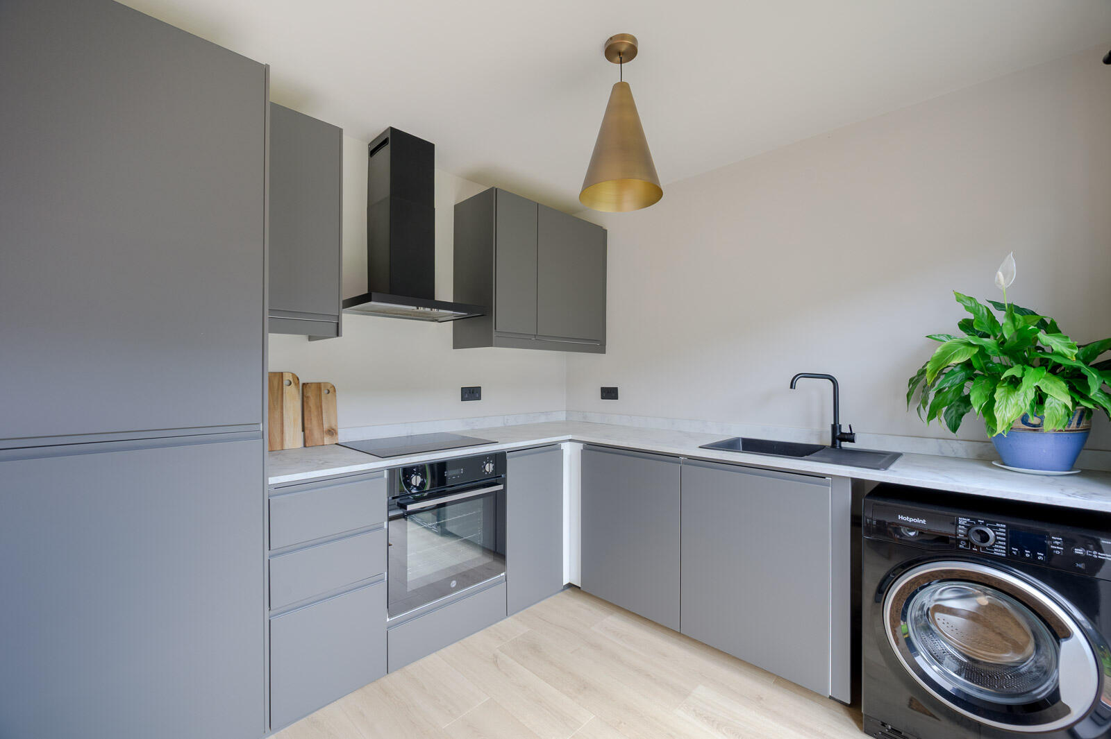 Kitchen with excellent range of high and low level units, laminate worktop, matt black sink and matt black mixer tap, integrated fridge freezer, built-in low level oven, four ring ceramic hob, extractor hood above, plumbed for washing machine, laminate wooden floor, open to ample dining space, built-in under stairs storage cupboard with access to electrics, uPVC double glazed French doors leading to rear garden.