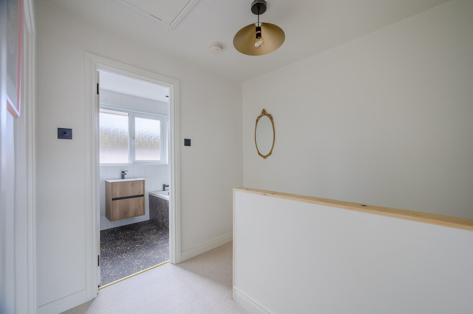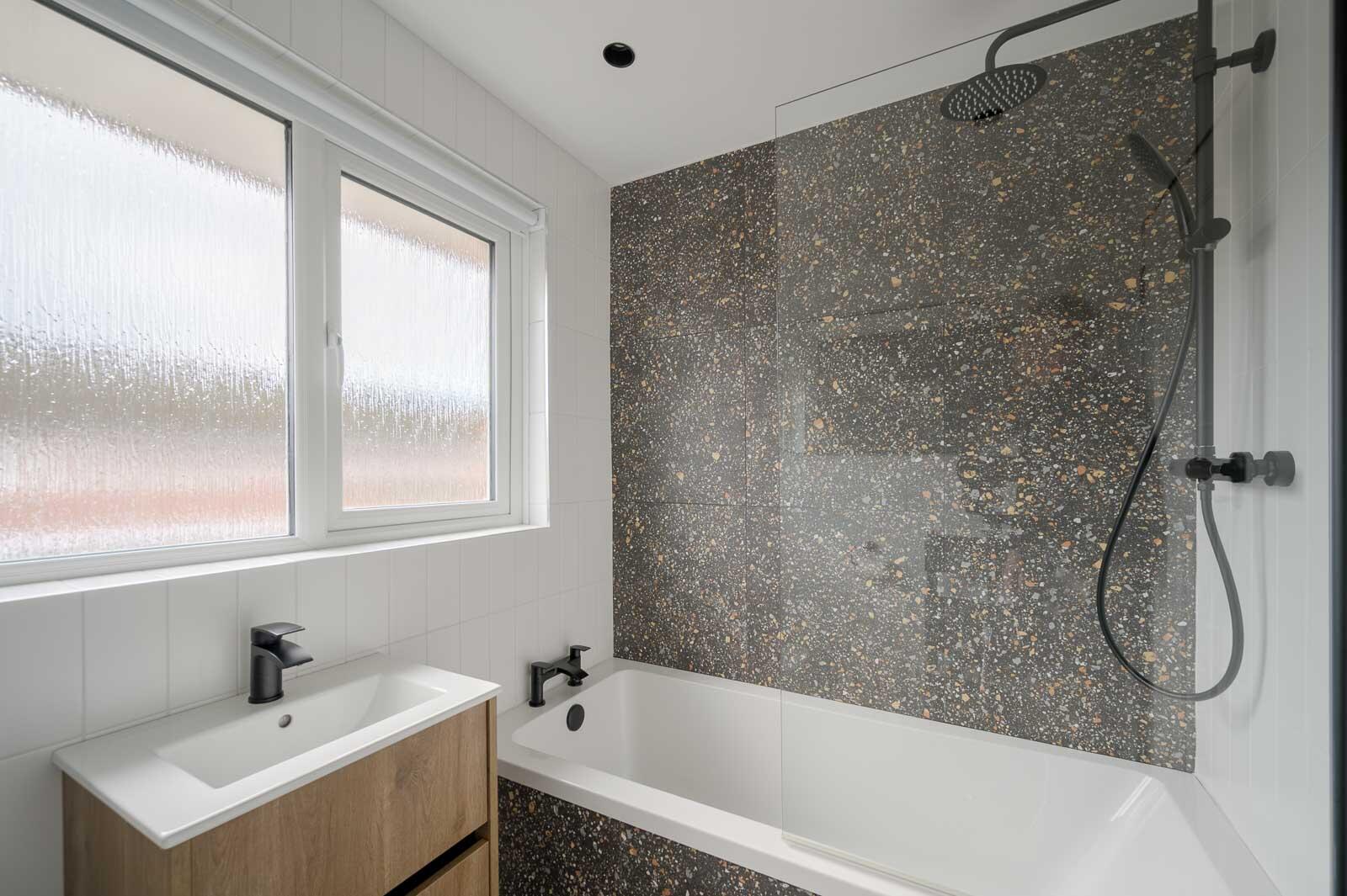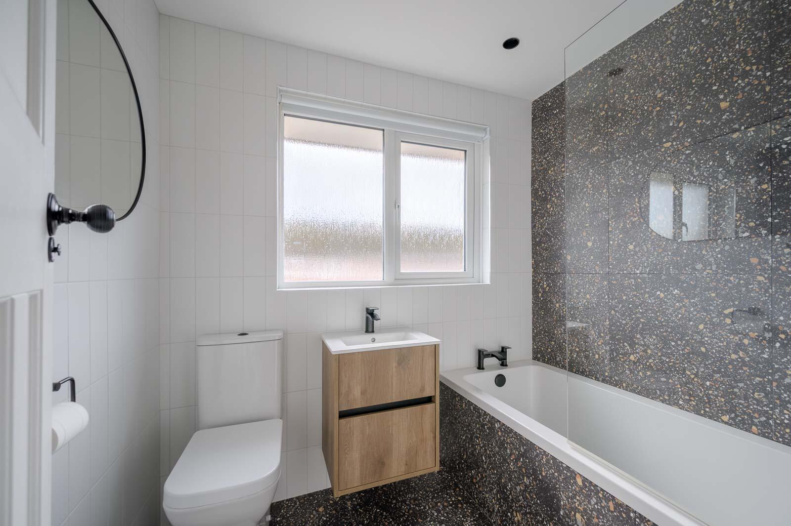 Modern white suite comprising low flush WC with push button, vanity unit with matt black mixer tap, tiled panelled bath with matt black mixer tap, thermostatically controlled valve, telephone hand unit and overhead shower, fully tiled walls, porcelain tiled floor, matt black heated towel rail, low voltage recessed spotlighting, frosted glass window.