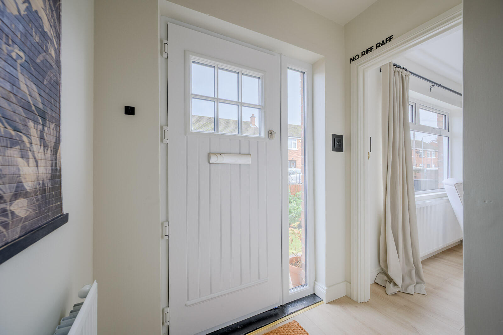 Composite glazed front door and sidelight window leading into spacious reception hall.