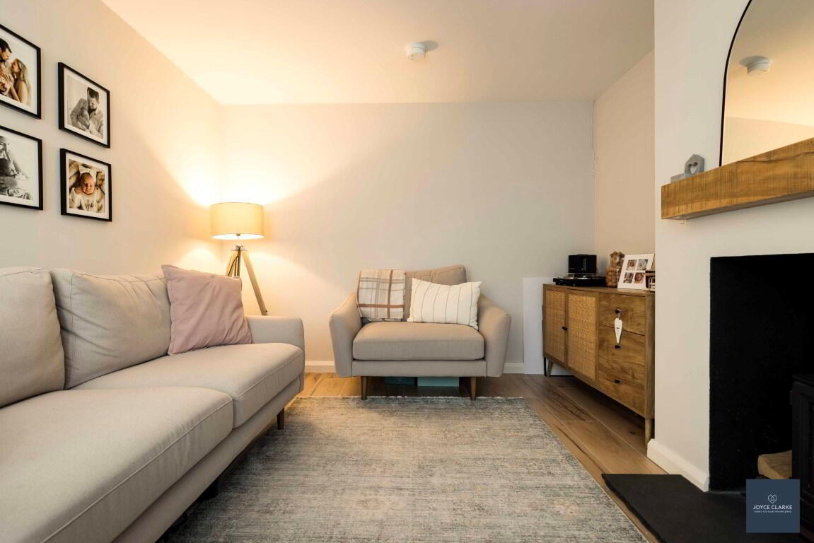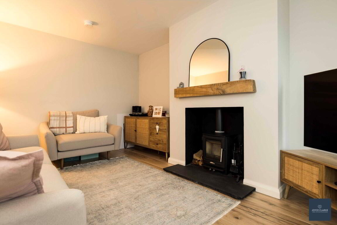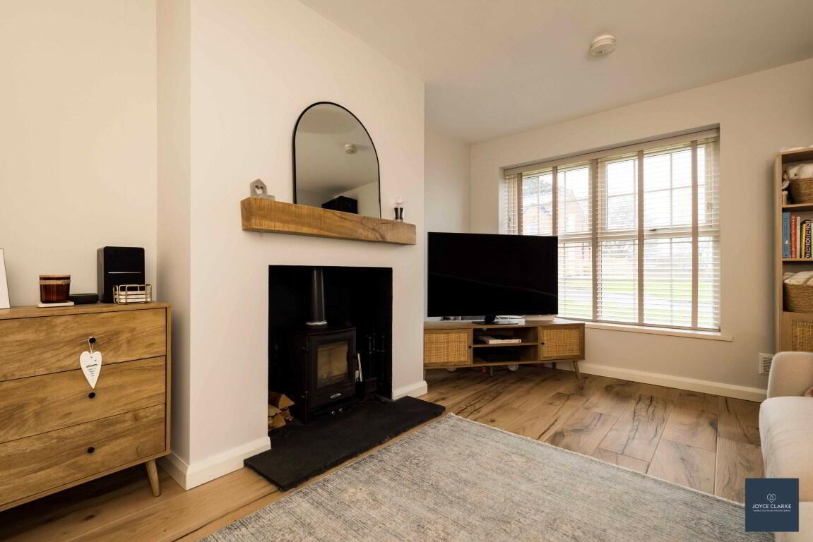 Front aspect reception room overlooking green area with feature fireplace including multi fuel stove on slate hearth with wood beam mantle above. Wood effect tiled flooring. TV point. Double panel radiator.
