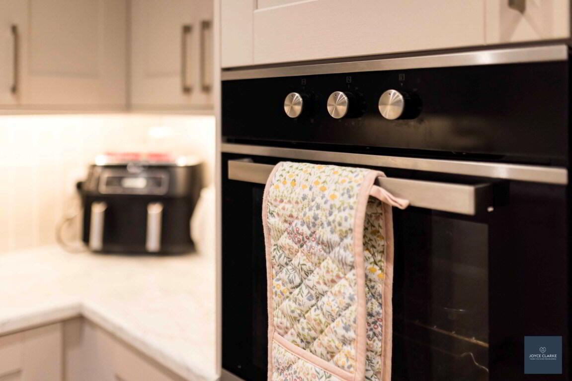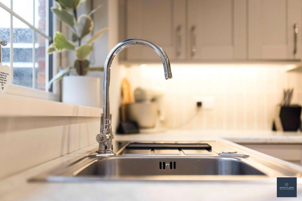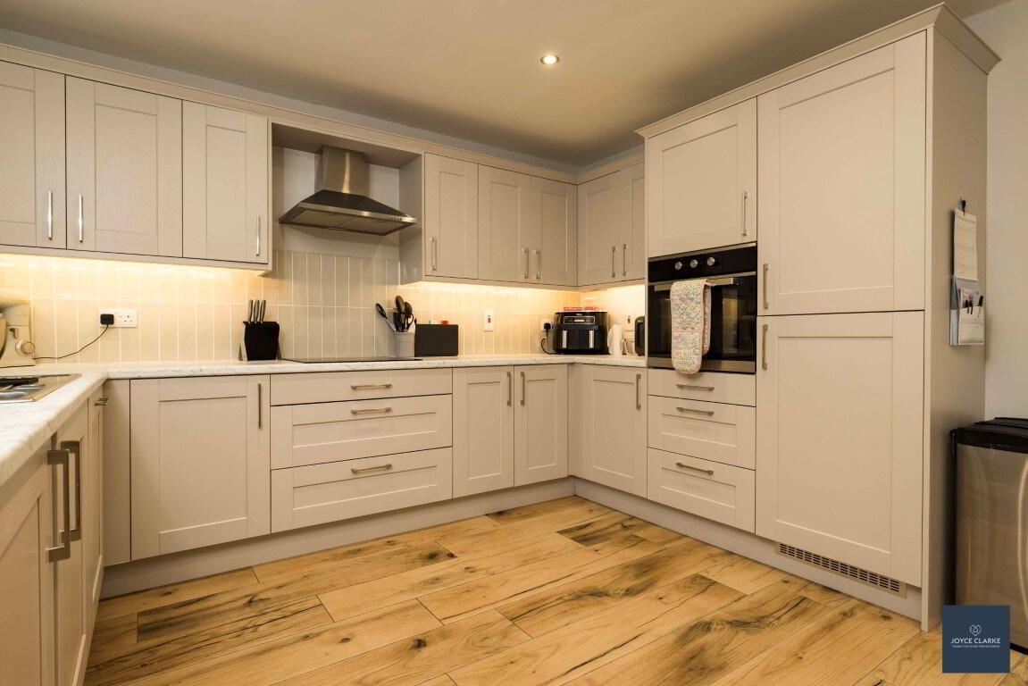 Spacious kitchen diner with excellent range of high and low level kitchen cabinets including saucepan drawers, lazy Susan in corner unit and under unit lighting. Full range of appliances include eye level electric oven, four ring electric hob with stainless steel extractor canopy above, integrated fridge freezer, dishwasher and washing machine. Wood effect tiled flooring and selected tiled splashback. Walk-in storage closet with gas boiler. Double panel radiator. Recessed lighting. UPVC framed double patio doors leading to rear garden.
