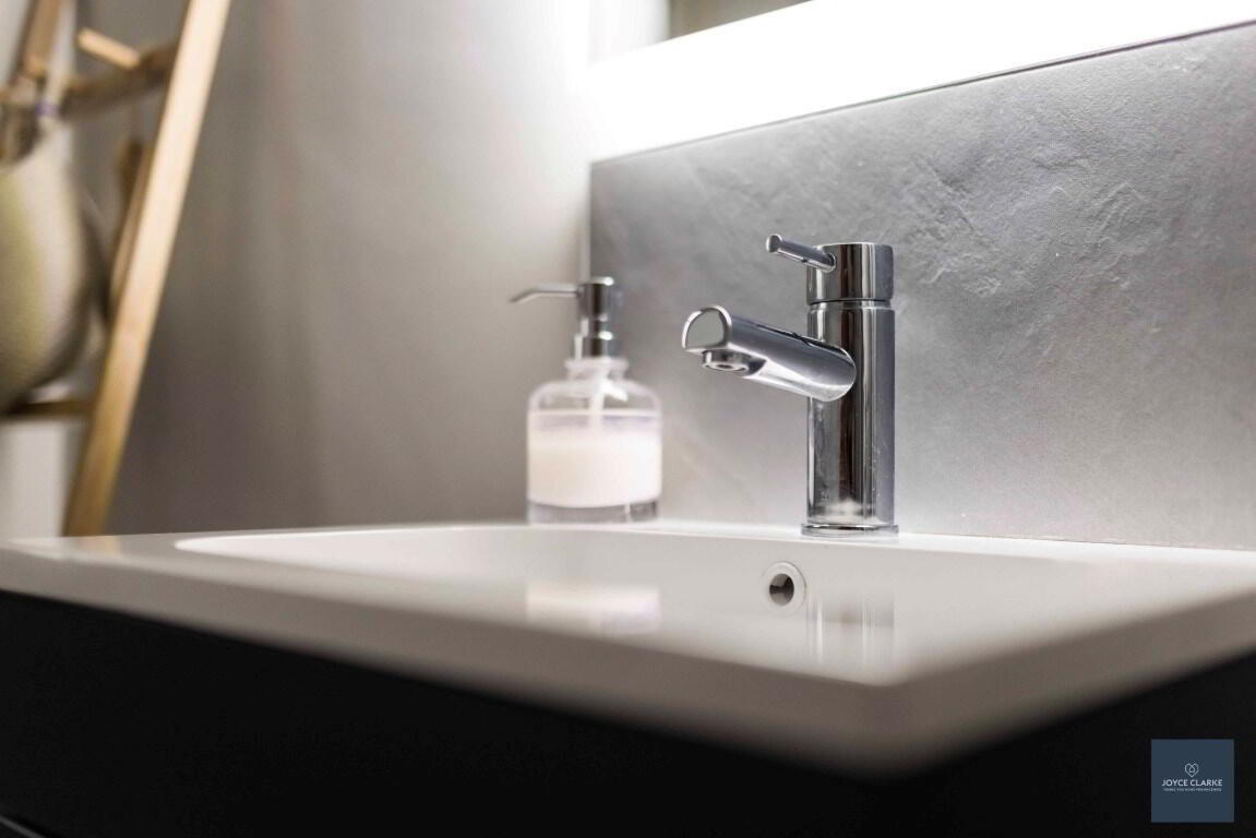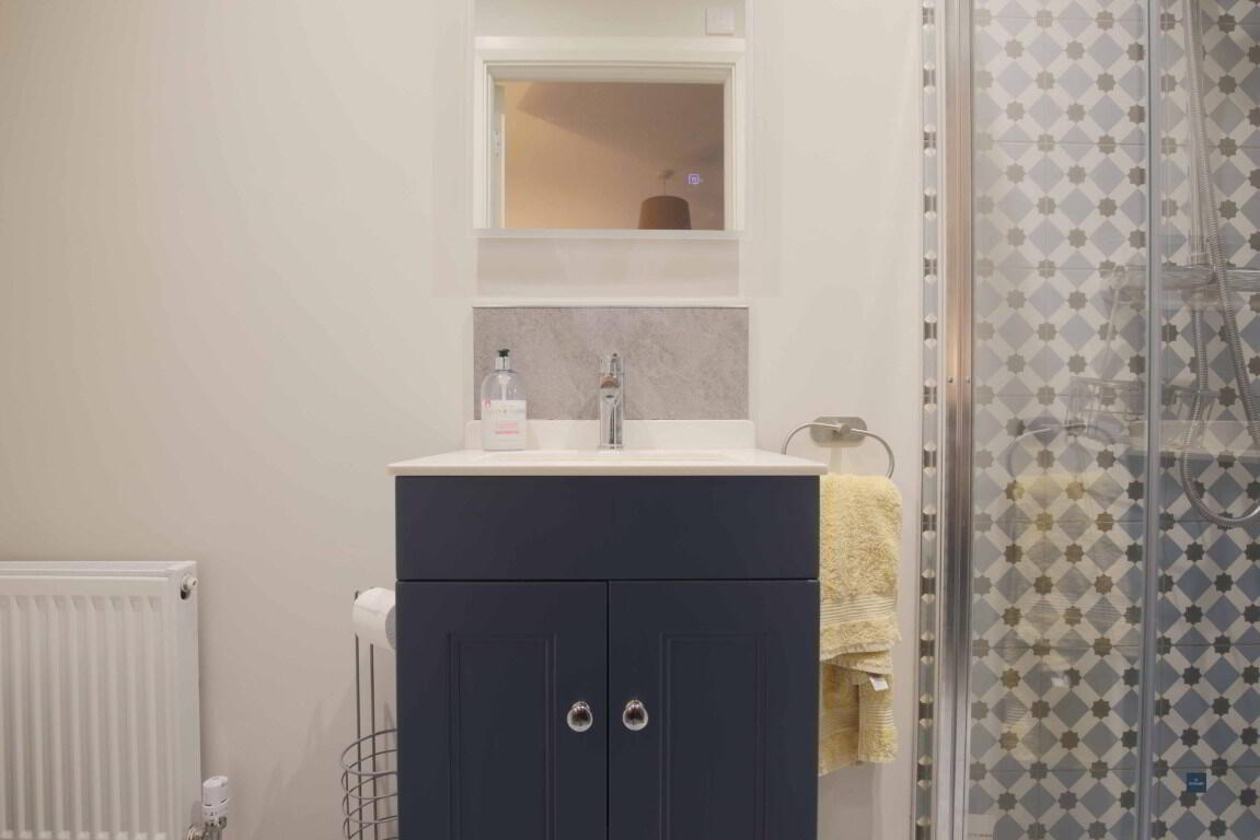 Tiled shower enclosure with mains fed shower including rainfall shower head. Back to wall dual flush WC and wash hand basin with vanity unit below. Single panel radiator. Tiled flooring and splashback. Extractor fan. Recessed lighting.