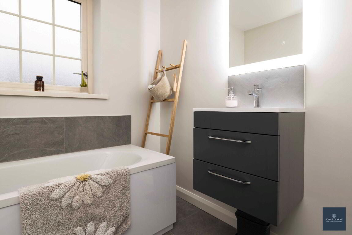 Four piece bathroom suite comprising of panel bath, back to wall dual flush WC, wall hung wash hand basin with vanity unit below and tiled shower quadrant with mains fed shower. Heated towel rail. Tiled flooring and splashback to bath area and wash hand basin. Recessed lighting. Extractor fan.