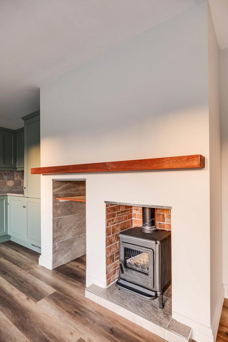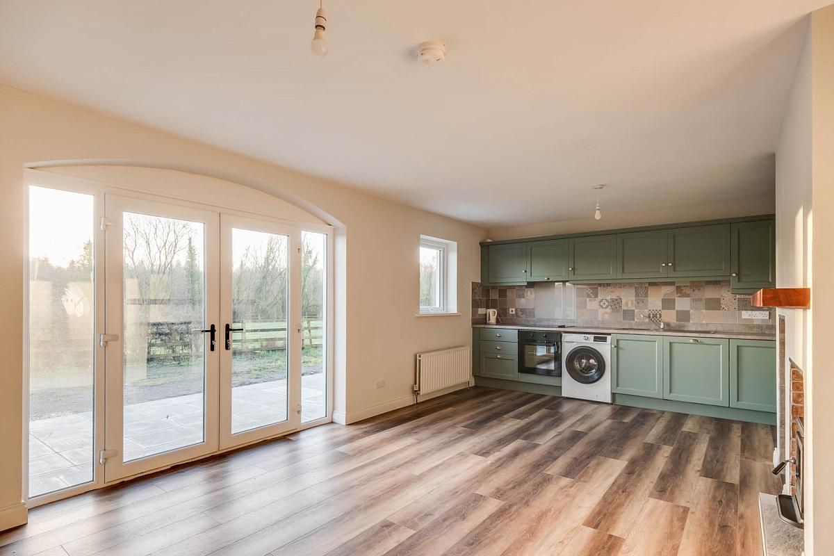 Fitted Kitchen with a range of high & low level units, integrated electric hob, oven & grill, dishwasher, fridge freezer, washing machine, stainless steel sink unit, extractor fan hood, tiled & glazed splash back, multi fuel stove, sleeper mantle, shelving & fire log alcove, PVC double patio doors with glazed side screens leading to paved patio area.