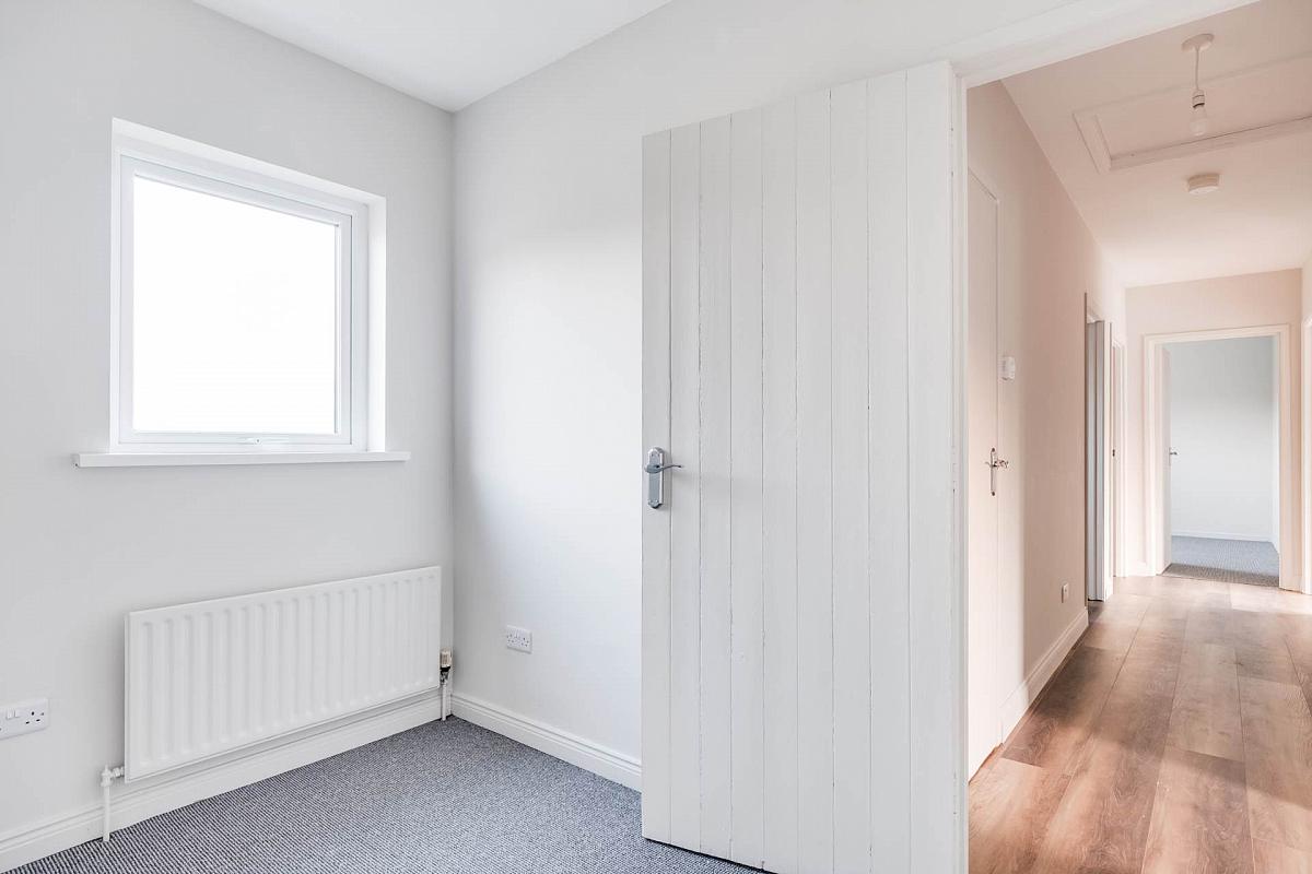 PVC exterior door with glazed inset, laminate flooring.