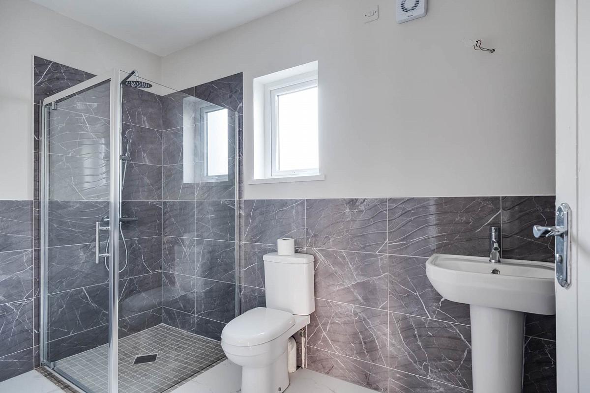 White suite, step in shower cubicle with thermostatically controlled shower, wet room tiled floor, half tiled walls, laminate flooring, heated towel rail.
