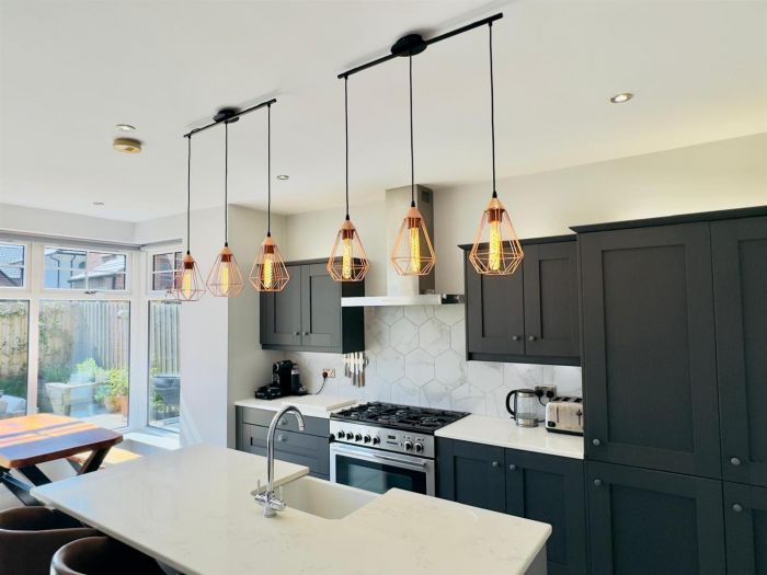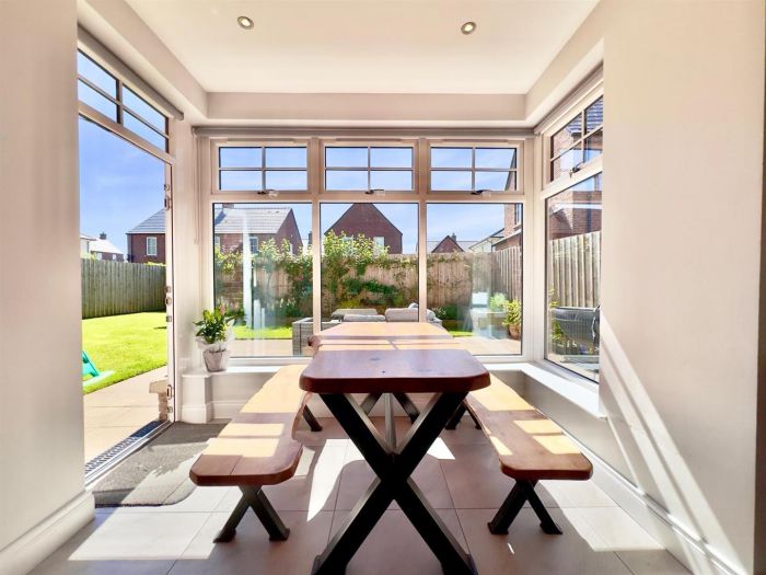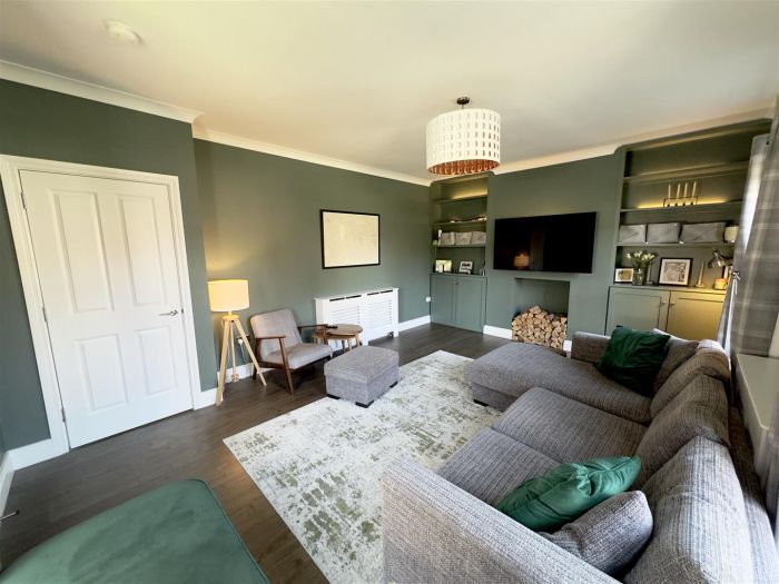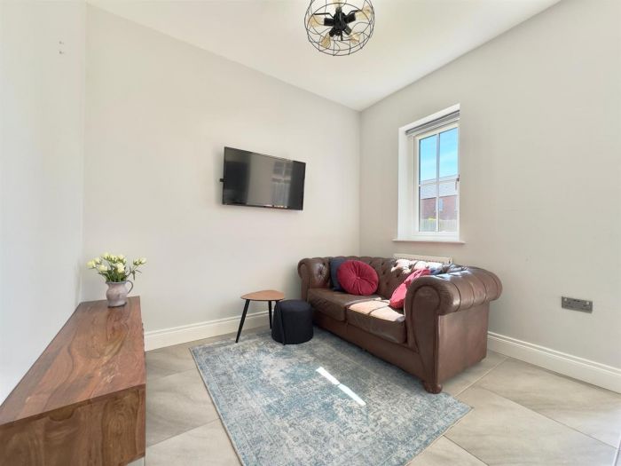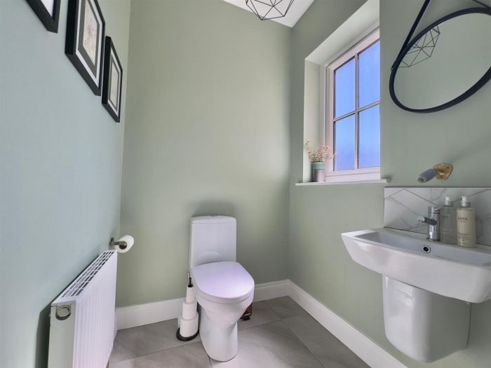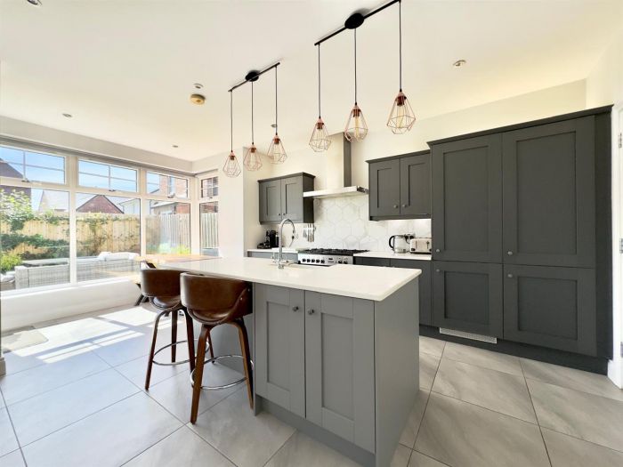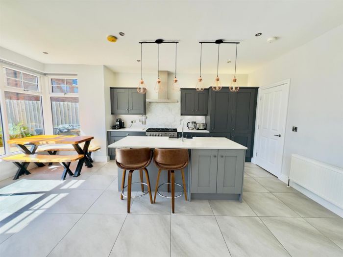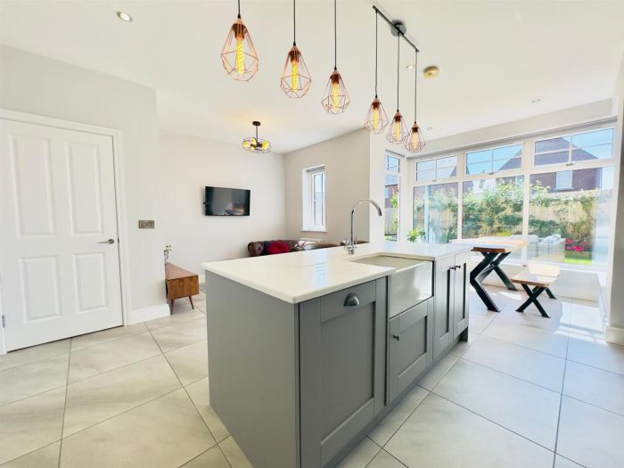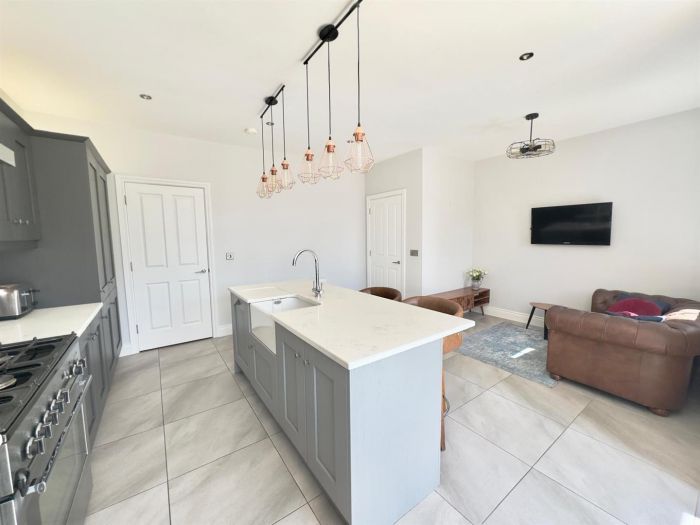 Internally the beautifully appointed accommodation comprises: tiled entrance hall with downstairs WC, spacious lounge with dual aspect and a fantastic well appointed kitchen finished to the highest standard with an excellent range of high and low level units, quartz worktops, integrated appliances and centre island unit open to a casual dining area, which flows seamlessley out onto the rear garden.