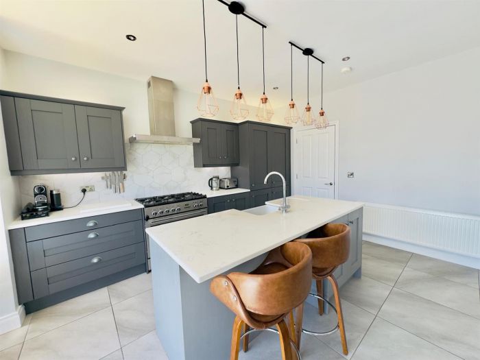 Fitted kitchen with range of high and low level units and complemented by quartz work surfaces, centre island with Belfast sink and breakfast bar area, range cooker space, stainless steel extractor fan, integrated fridge & freezer, integrated dishwasher, plumbed for washing machine, hexagonal tiled splashback, tiled floor, pantry with space for tumble dryer and containing gas boiler, pvc double glazed double doors to garden