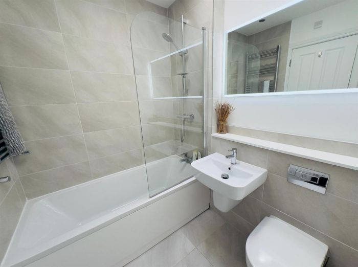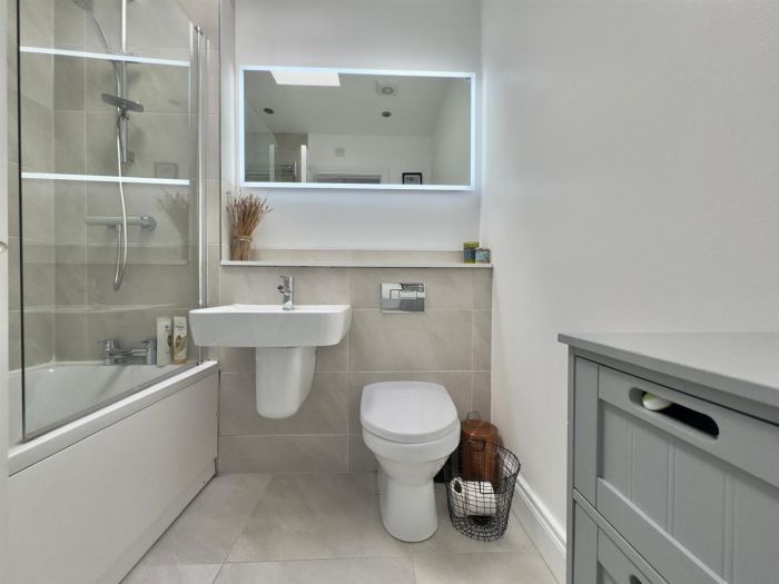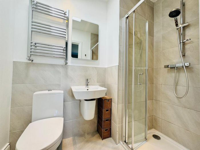 Semi pedestal wash hand basin, low flush wc, enclosed shower cubicle with thermostatically controlled shower, chrome towel radiator, tiled floor, velux window