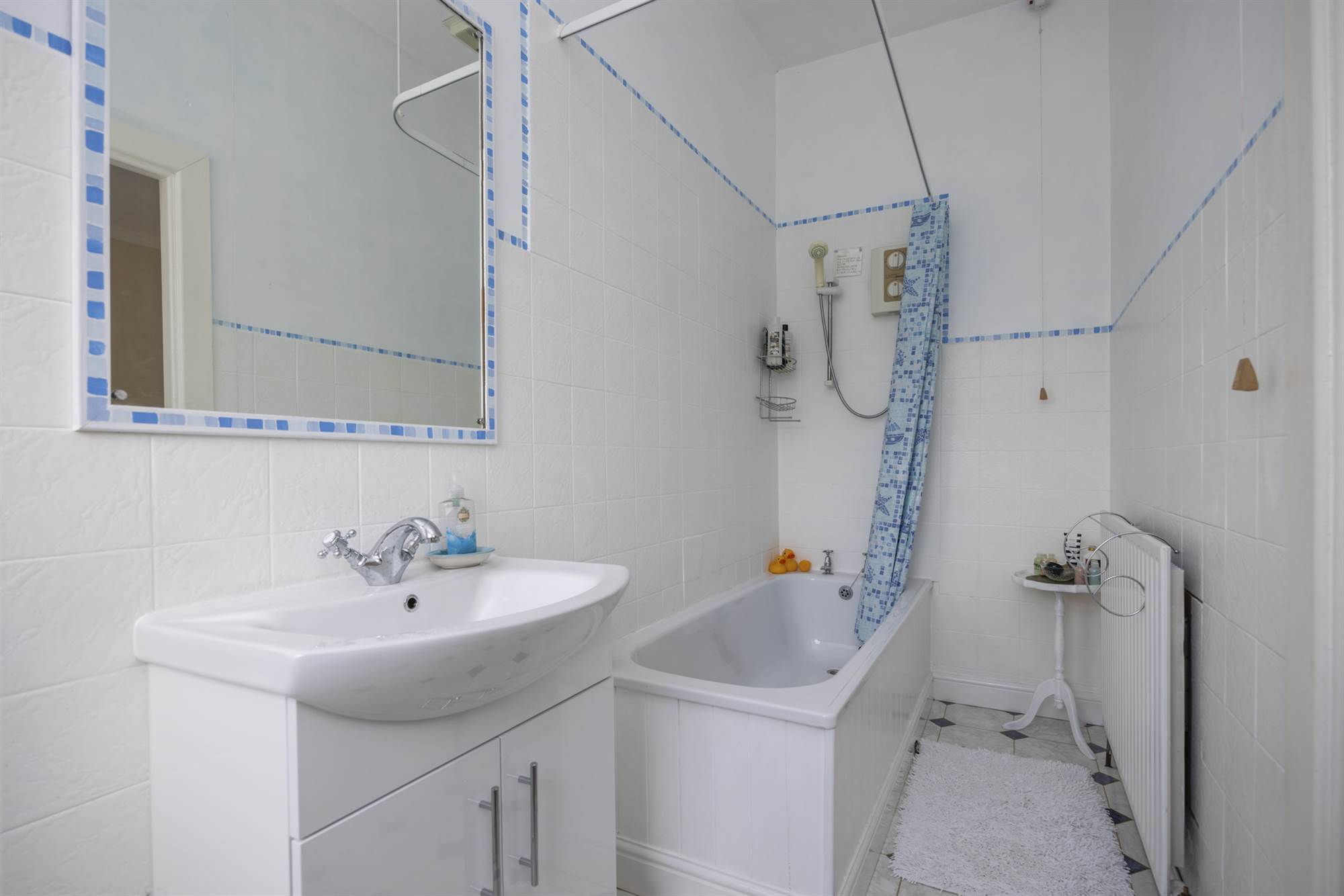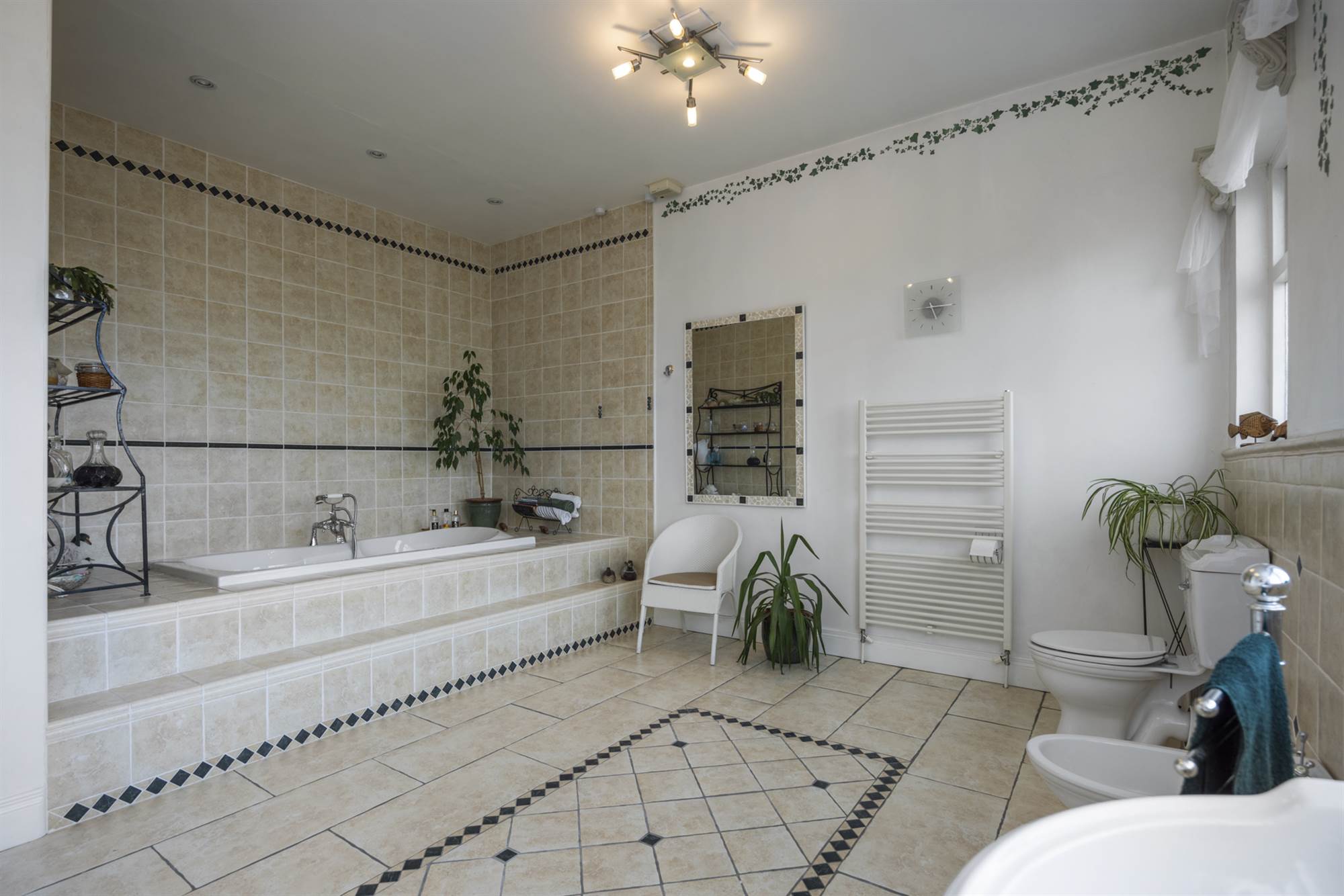 Raised panelled bath, mixer taps, telephone hand shower, low flush WC, pedestal wash hand basin ,bidet