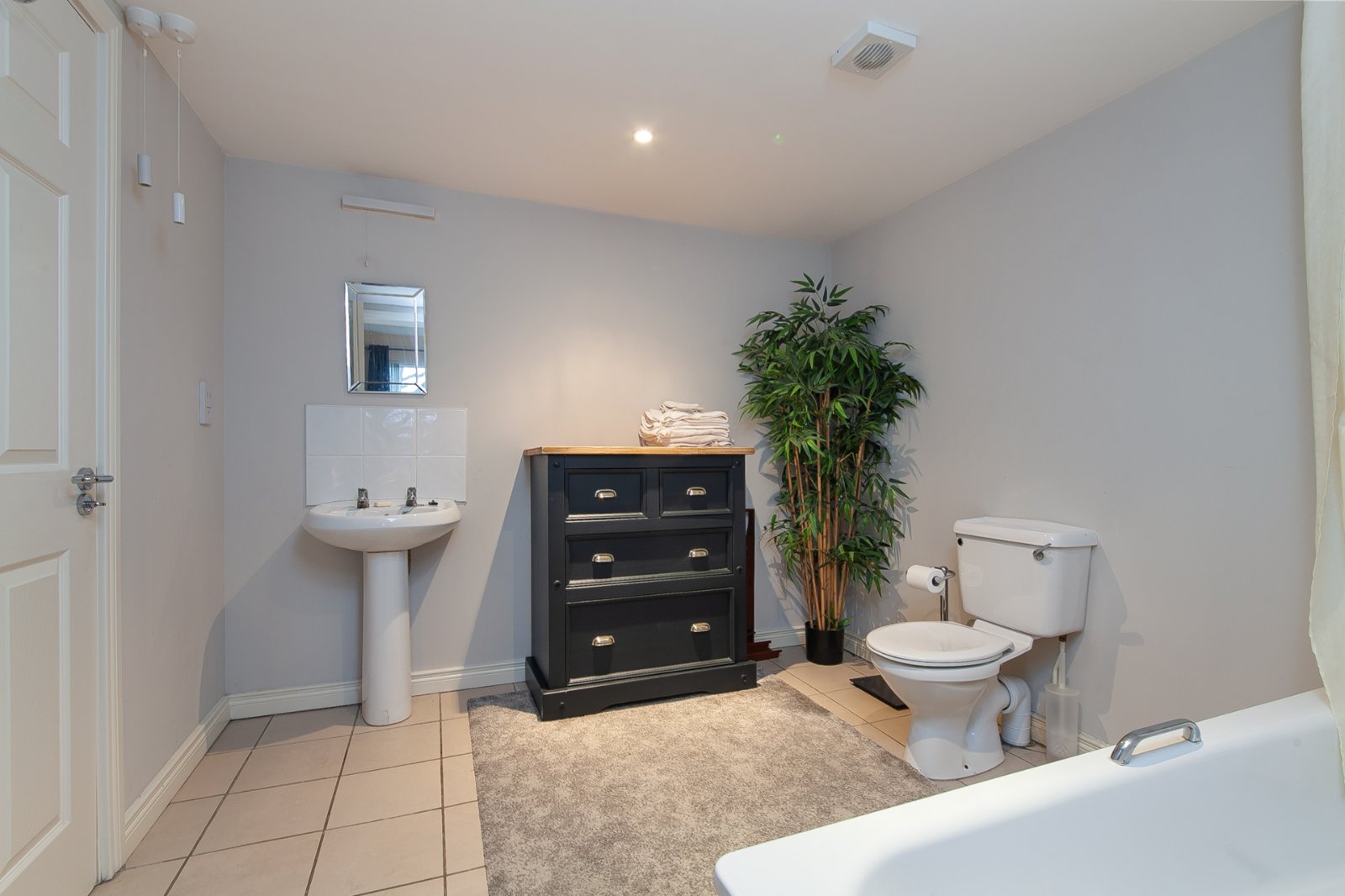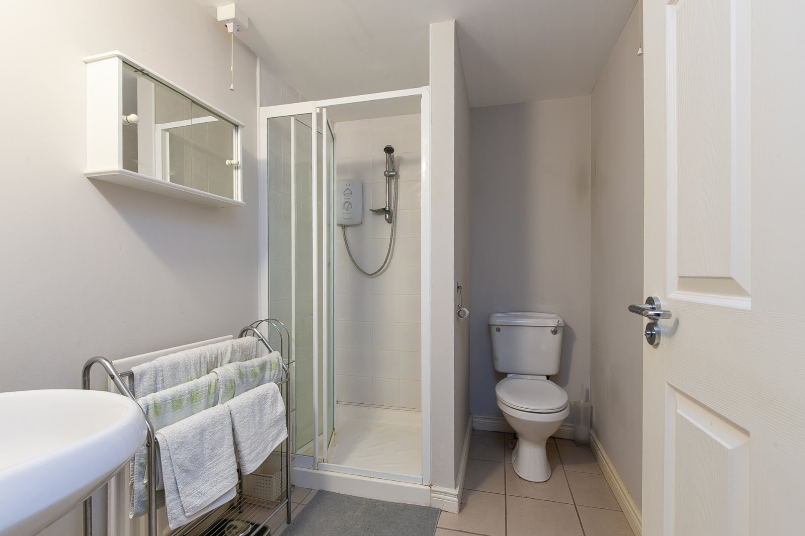 Ceramic tiled floor, low flush WC, pedestal wash hand basin, fully tiled shower cubicle with Redring electric shower, extractor fan, spotlighting