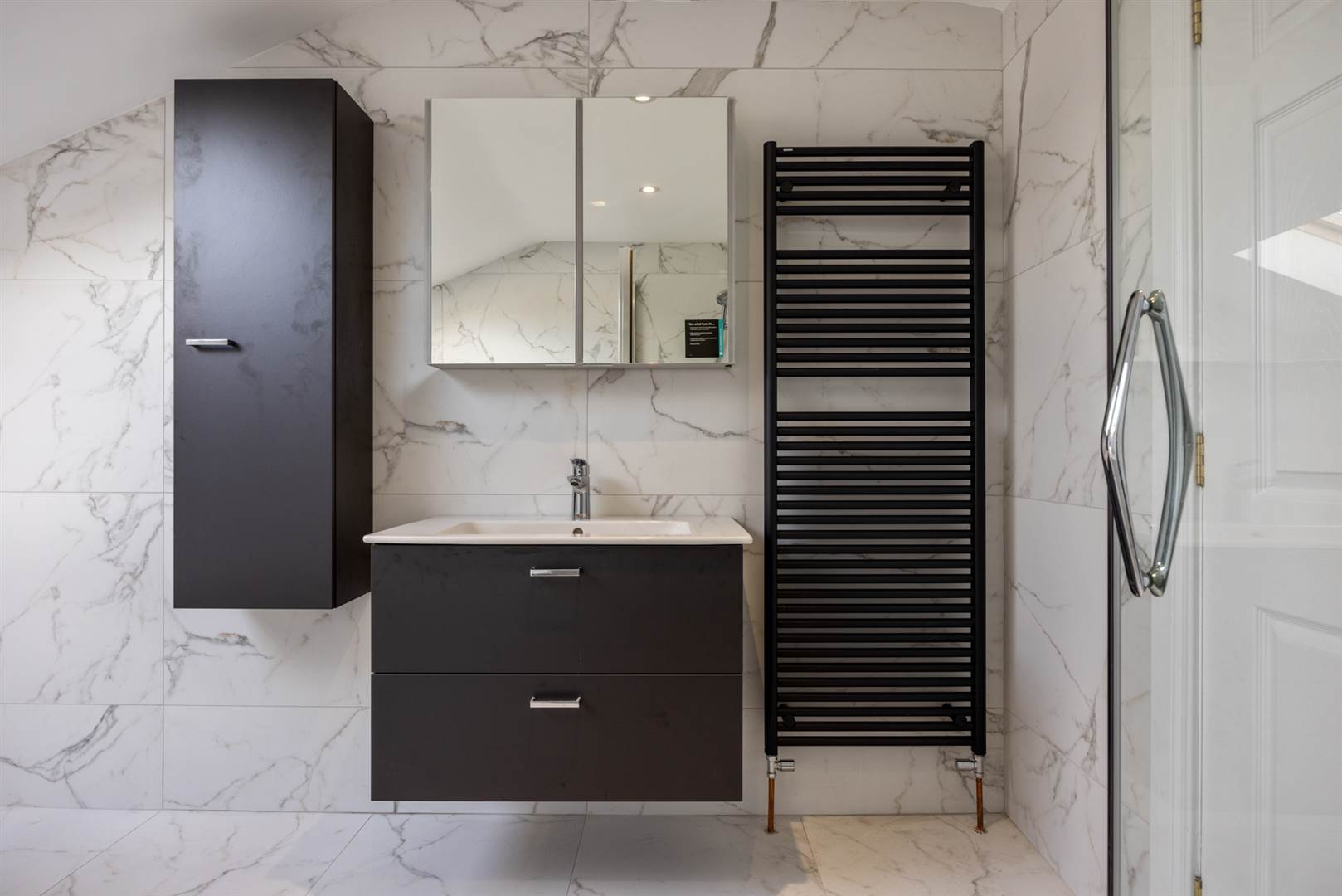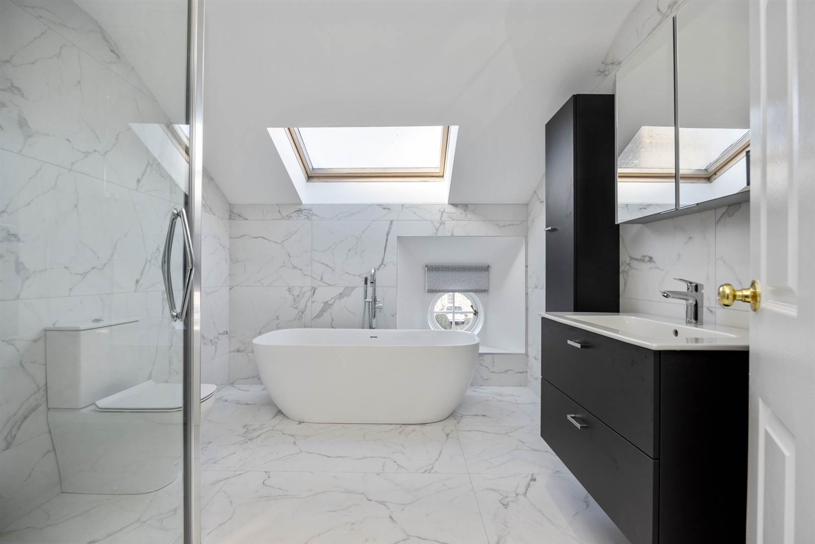 Stunning bathroom with free standing bath, swan neck tap and telephone shower, wall mounted Duravit sink unit with cabinet below, mixer tap, vanity mirror above with concealed shelving and lighting. Fully tiled large shower cubicle with Hansgrohe thermostatically controlled telephone shower, marble effect floor with matching tiled walls, wall hung unit with concealed shelving, heated towel radiator, double glazed Velux and feature port hole window.