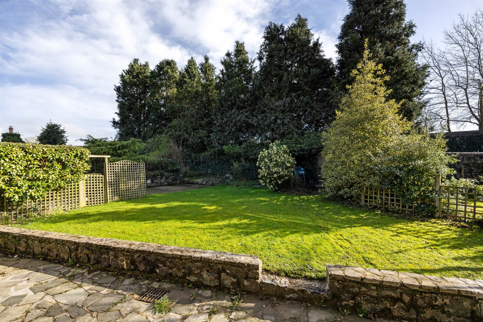 Fully enclosed rear garden laid in lawns, flowerbeds and patio area including the backdrop of the original stone wall.
