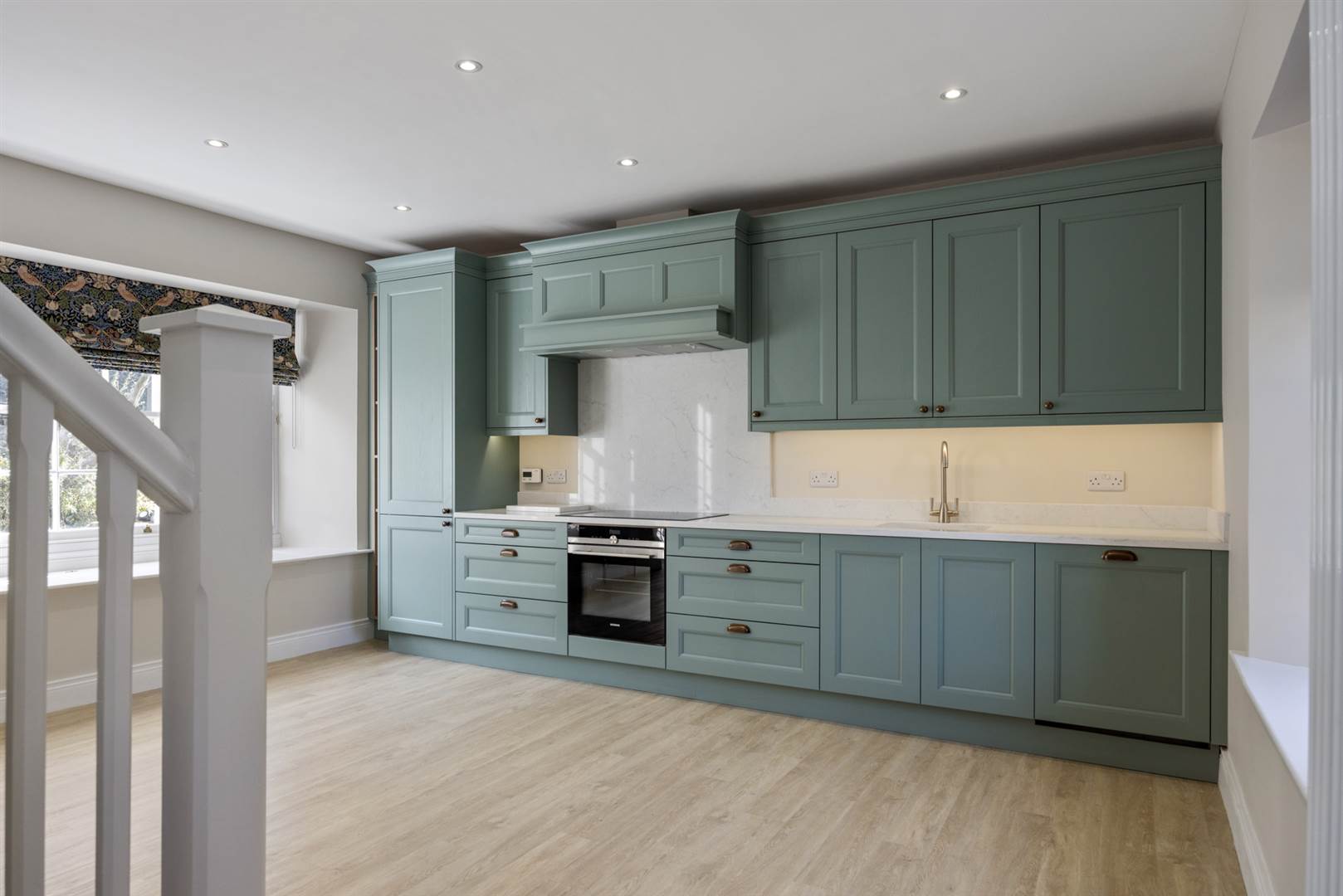 Extensive range of high and low level shaker units, quartz worktops, splashback and upstand, inset Villeroy & Boch sink unit and swan neck tap, four ring induction hob by Fisher & Paykel, Siemens under oven, integrated Siemens dishwasher, integrated fridge and freezer, feature window seats with concealed storage under, low voltage lighting, staircase leading to the first floor, glazed door to rear.