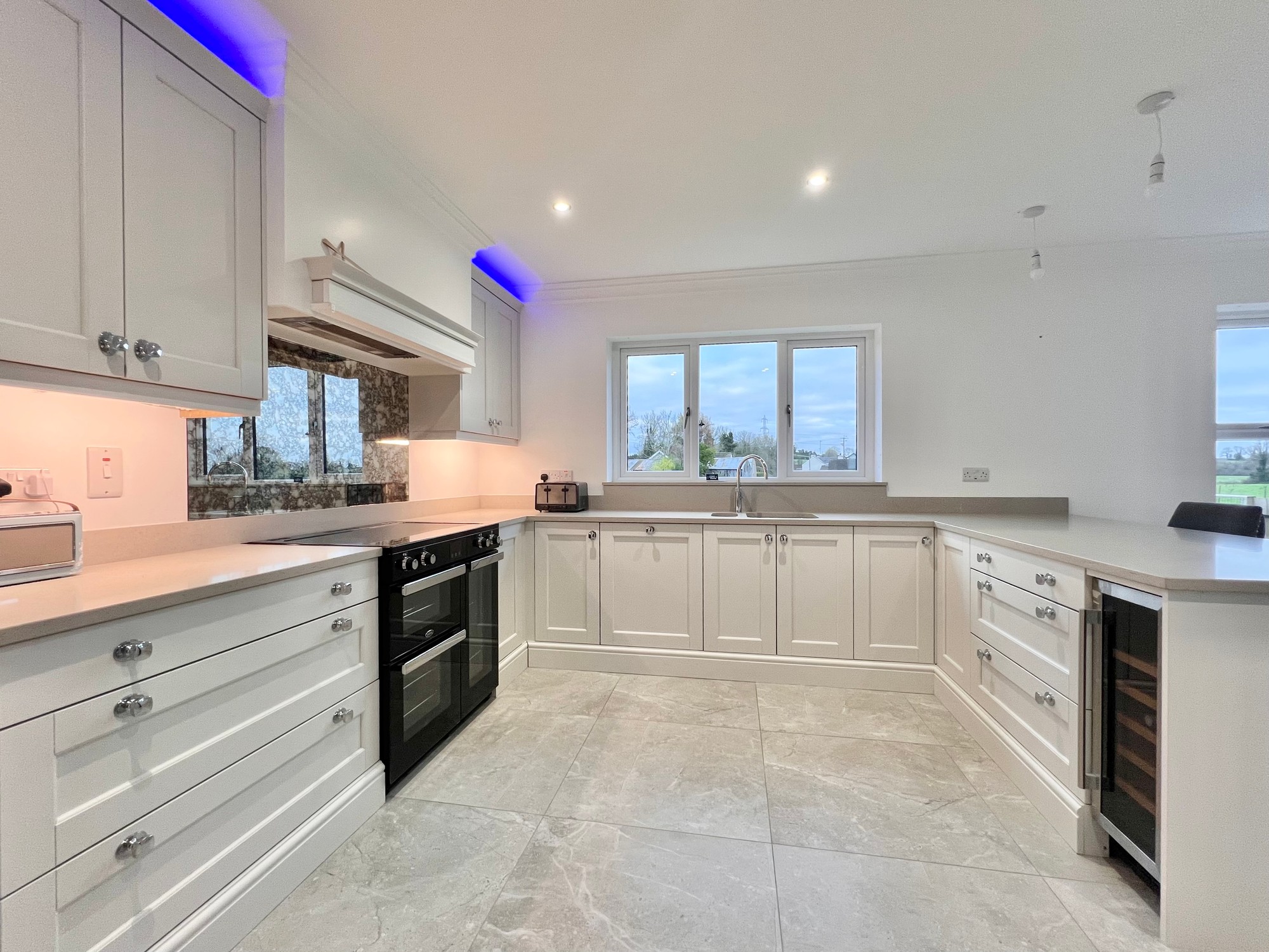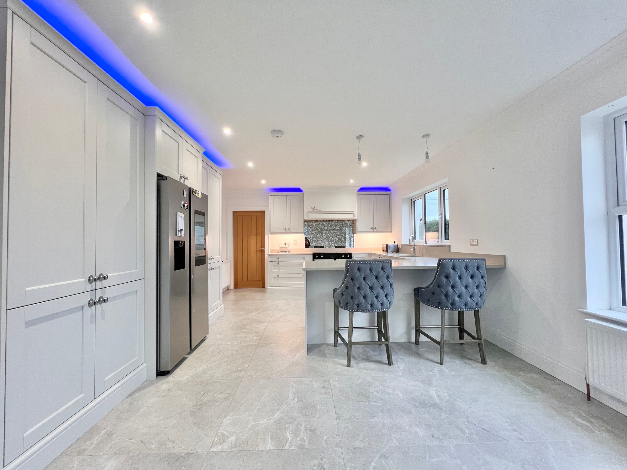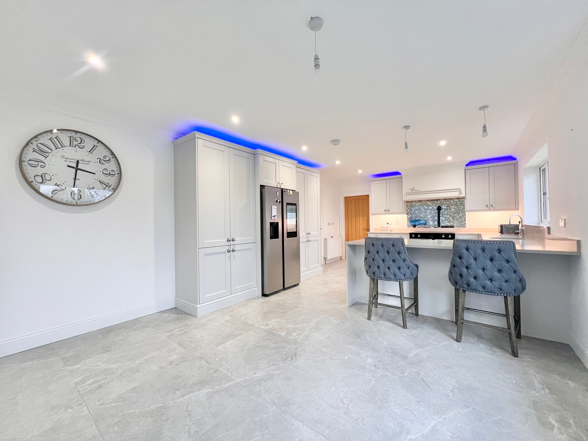 A high specification kitchen and dining area with tiled flooring and ceiling coving throughout. Solid wood eye and low level units, quartz worktops with matching upstands and an antique style mirror splashback. A three seater breakfast bar complements the layout. Integrated appliances include a Quooker boiling water tap, Belling five-ring induction cooker, Indesit dishwasher and a wine fridge. Floor-to-ceiling pantry units offer generous storage with space allocated for an American-style fridge-freezer. The kitchen flows seamlessly into an open plan dining area with direct access to the sun lounge.