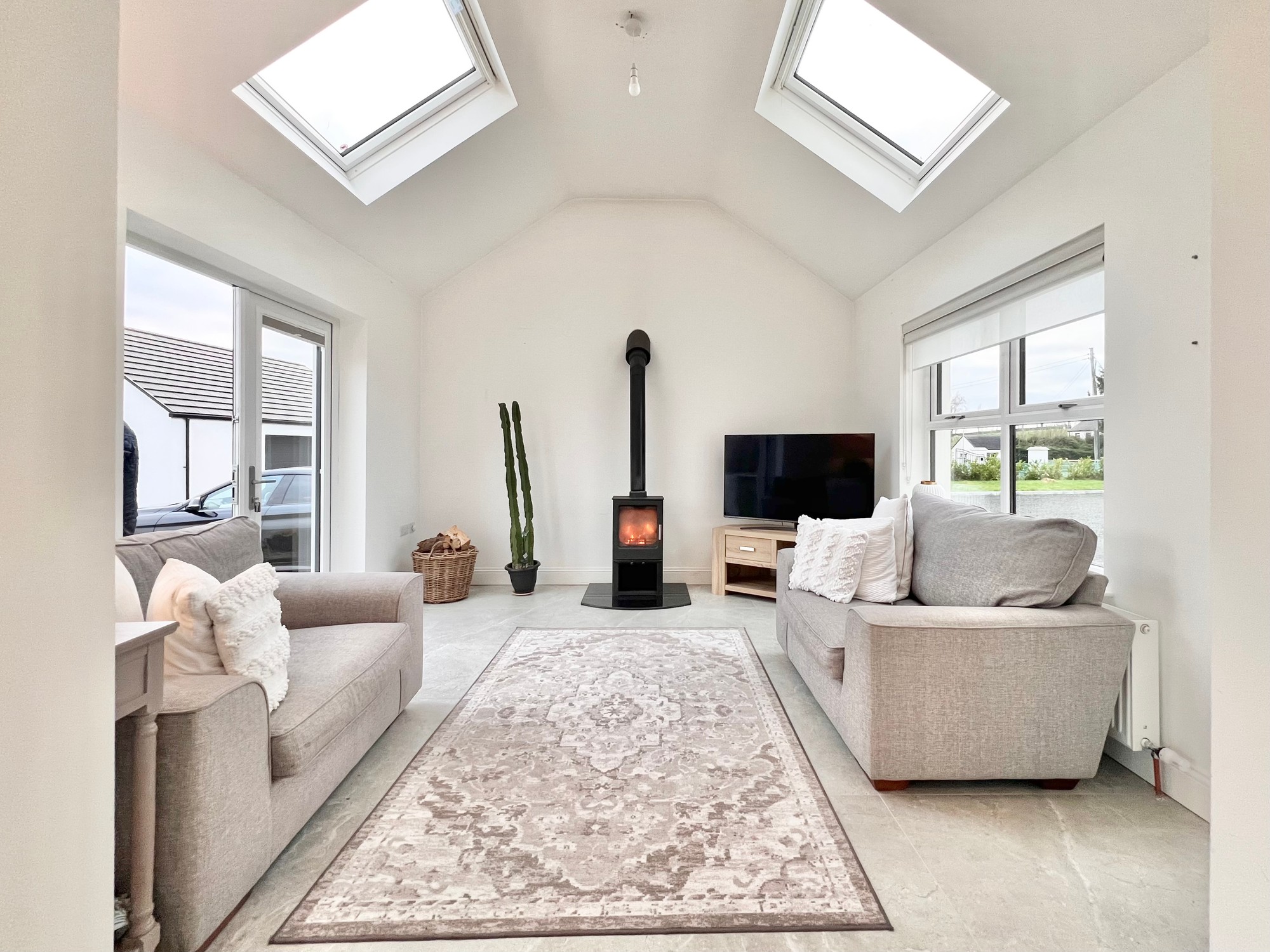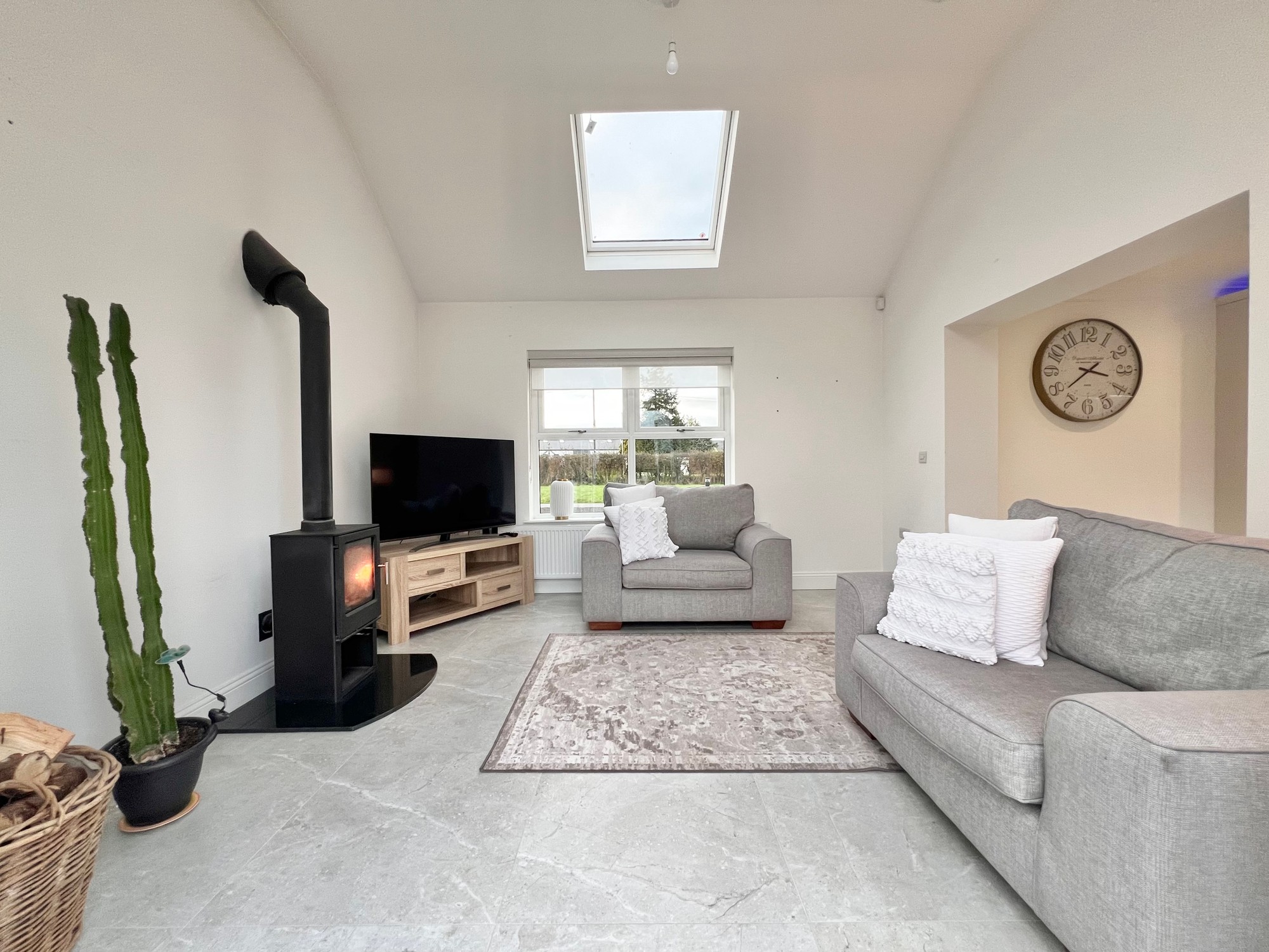 A bright, spacious living area with tiled flooring and a vaulted ceiling. A freestanding wood-burning stove sits on a marble hearth, and patio doors opne out to the rear of the property.