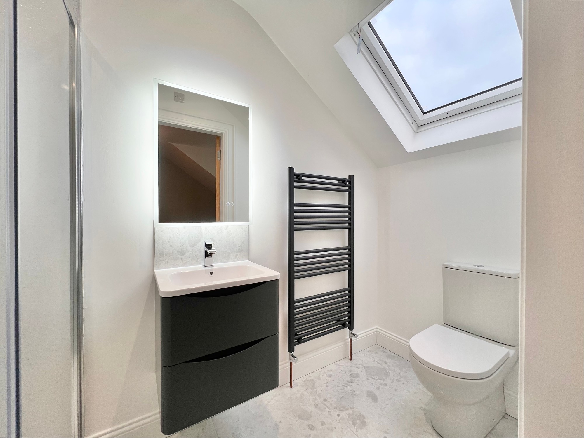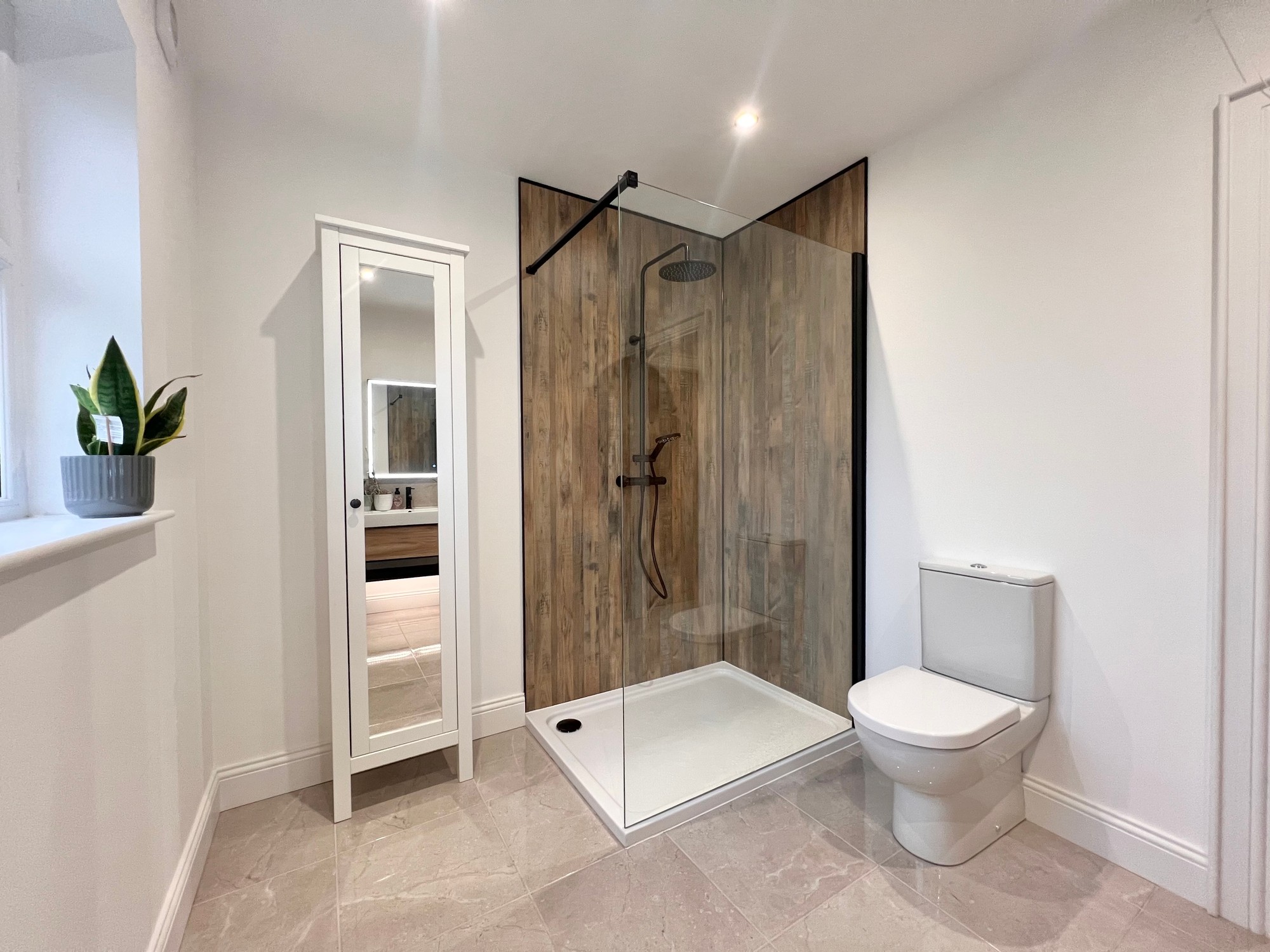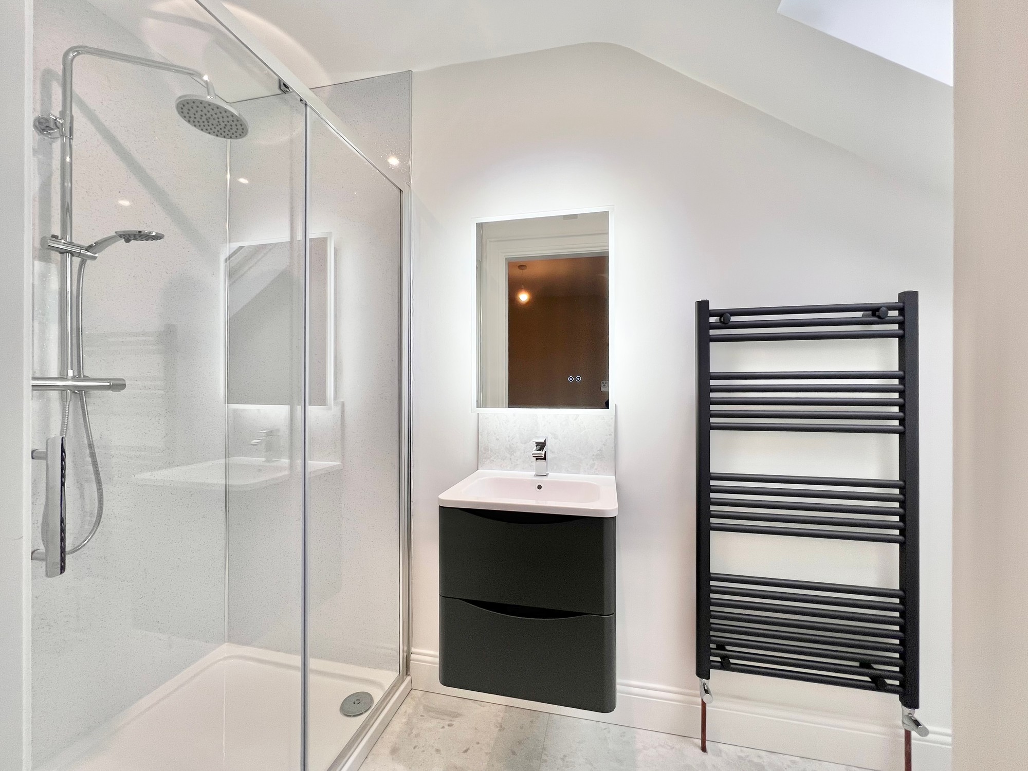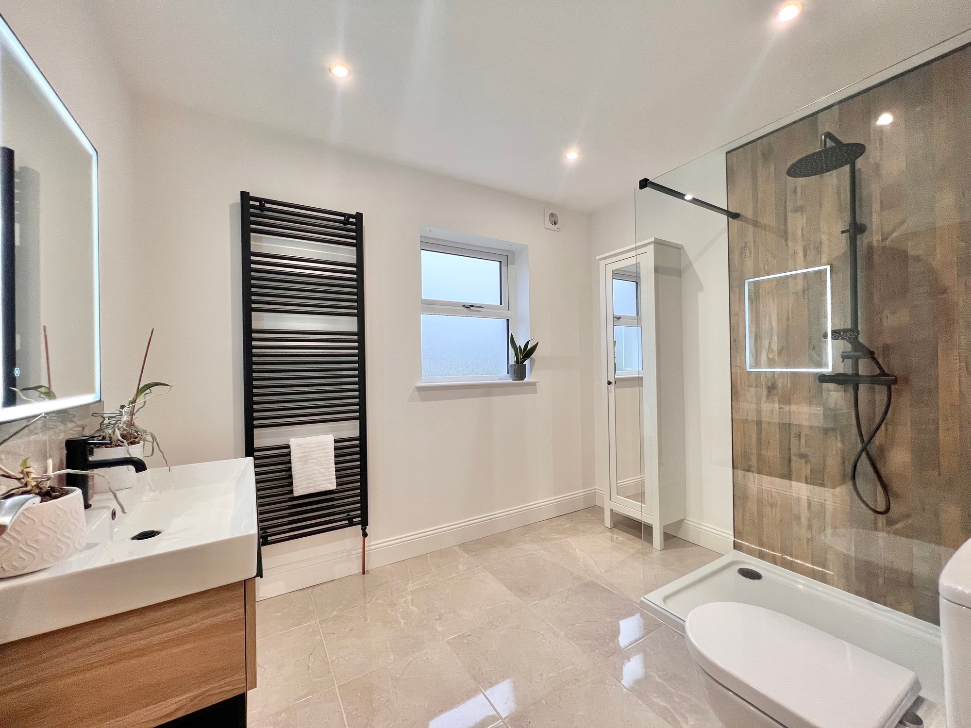 Contemporary three piece white suite comprising of wc, whb and vanity unit, walk in power shower with rainfall shower head, illuminated mirror point, feature towel rail, recessed lights, tiled floor.