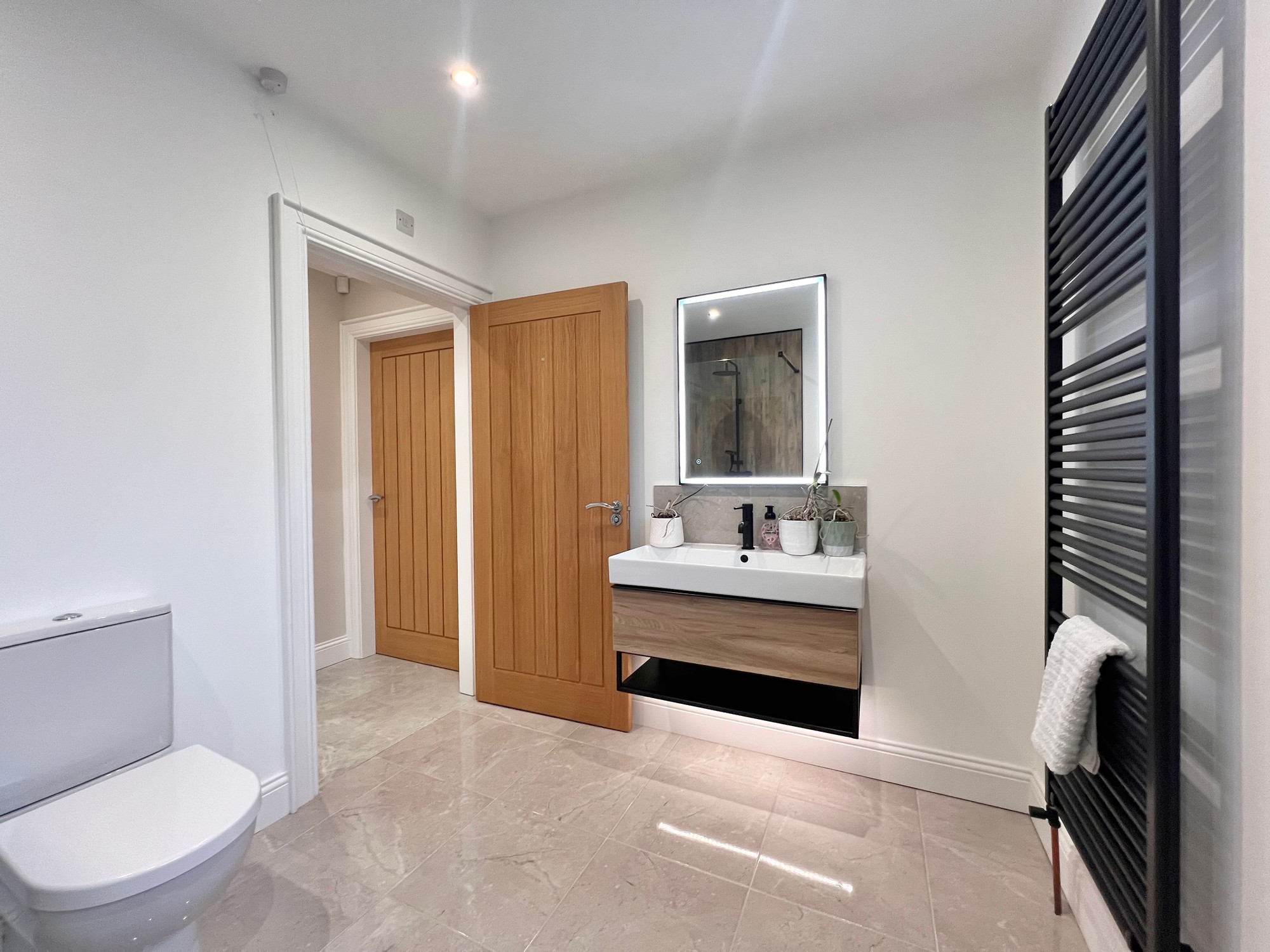 En-suite with contemporary three piece white suite comprising of wc, whb and vanity unit, illuminated mirror point, power shower, recessed lights, tiled floor.