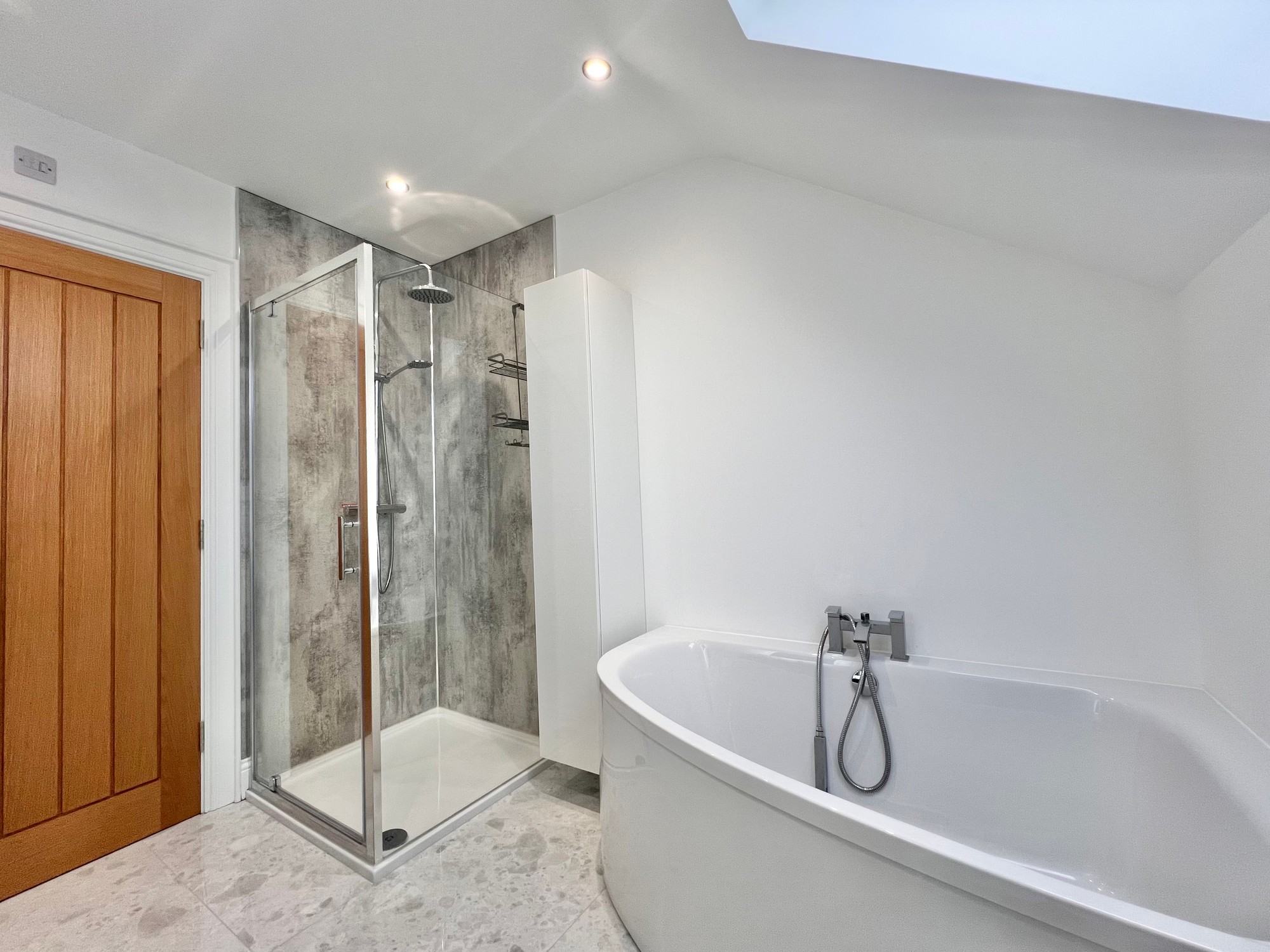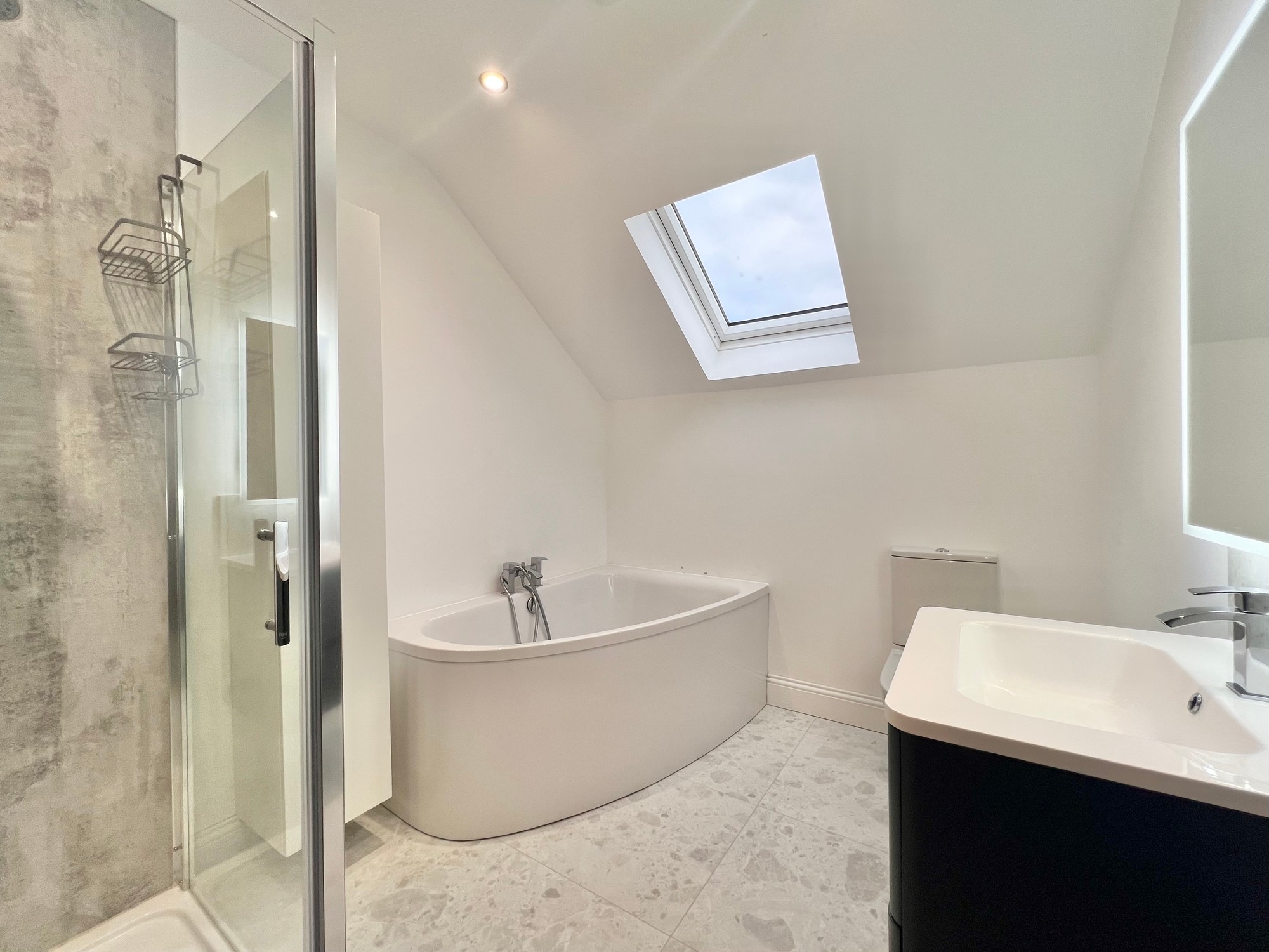 A contemporary white four piece suite comprising with corner bath, walk in power shower with rainfall shower head, wc, whb and vanity unit, feature towel rail, recessed lights, tiled floor.
