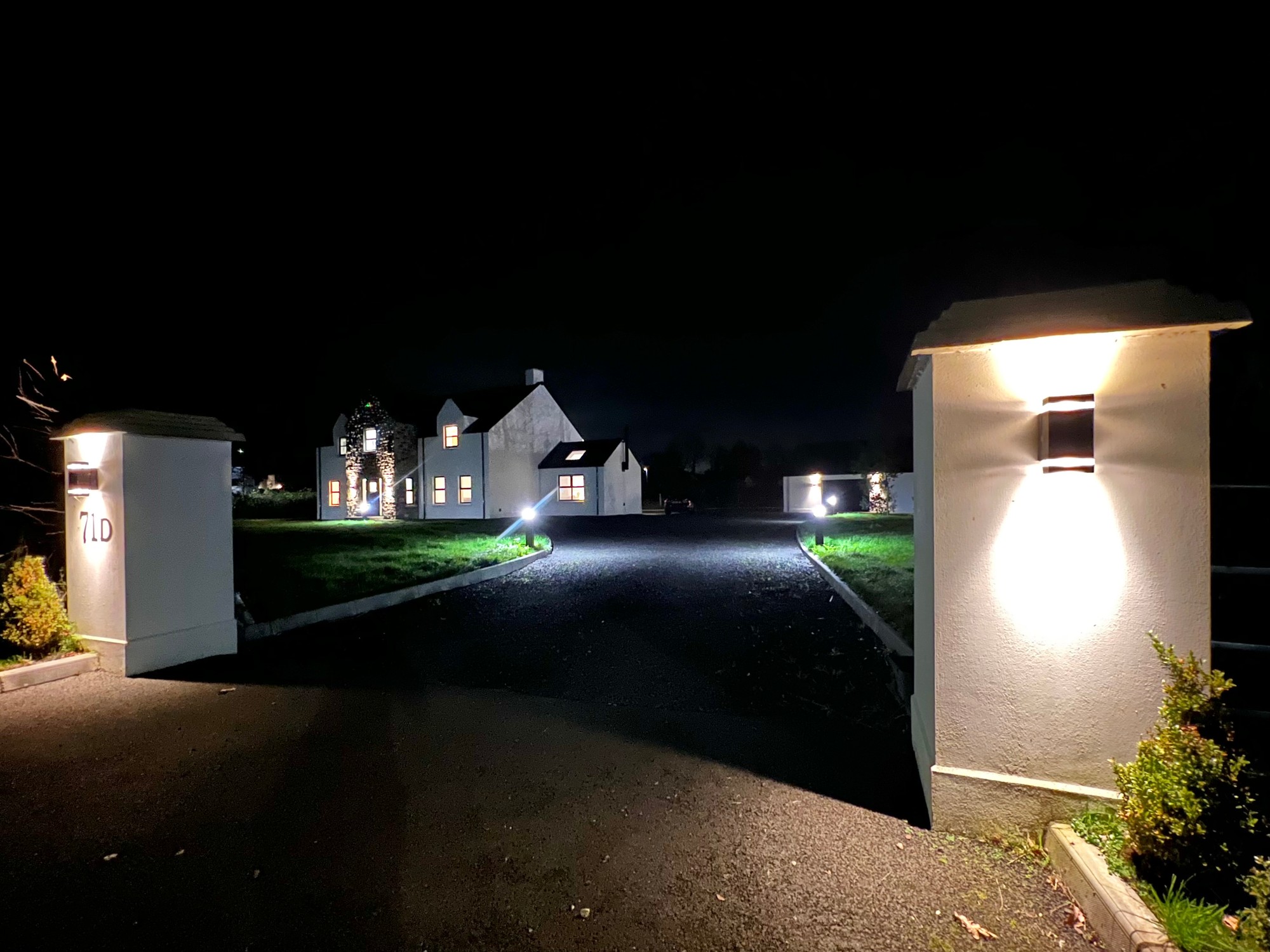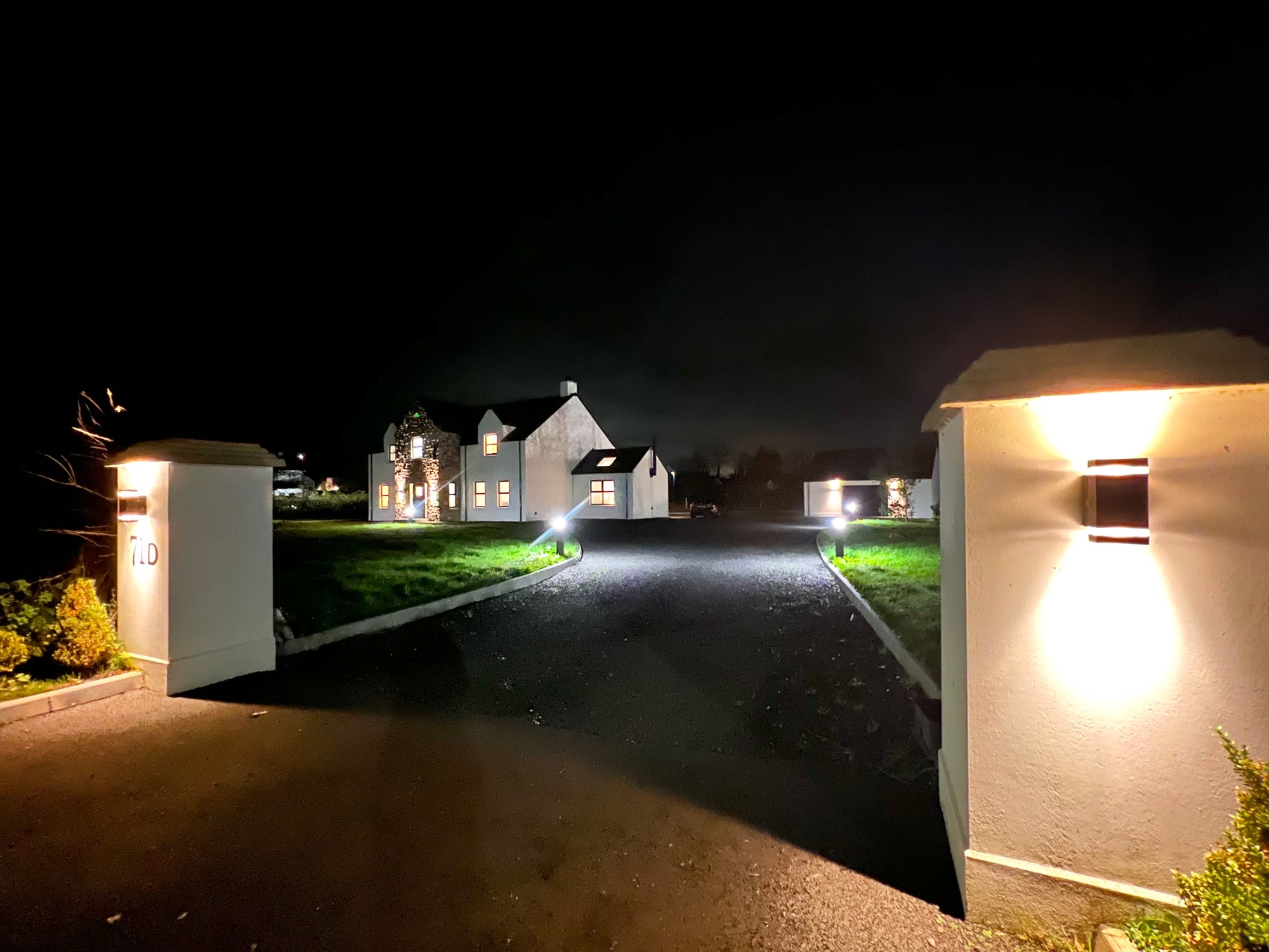 Feature entrance pillars with stone driveway leading to large detached garage with ample parking. Gardens laid in lawn to the front, side and rear. Exterior lighting and boundary fencing.