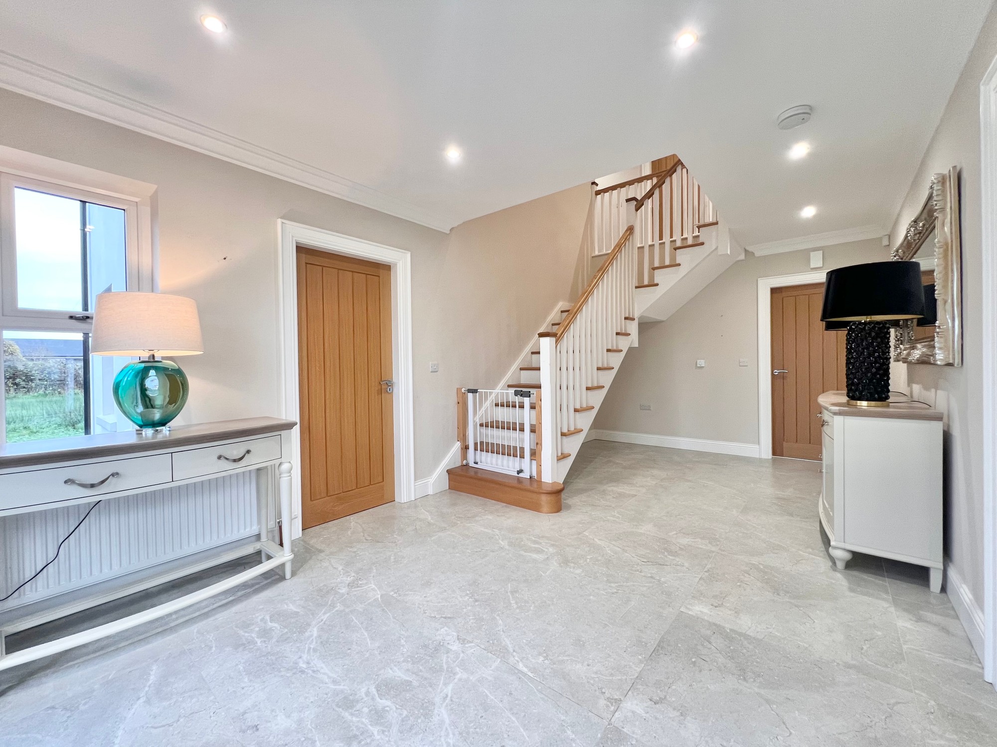 A bright, spacious and elegant entrance hall which showcases an impeccable design with modern tiled flooring and decorative ceiling coving, flowing toward an open solid oak staircase with a gallery balcony. Composite front door.