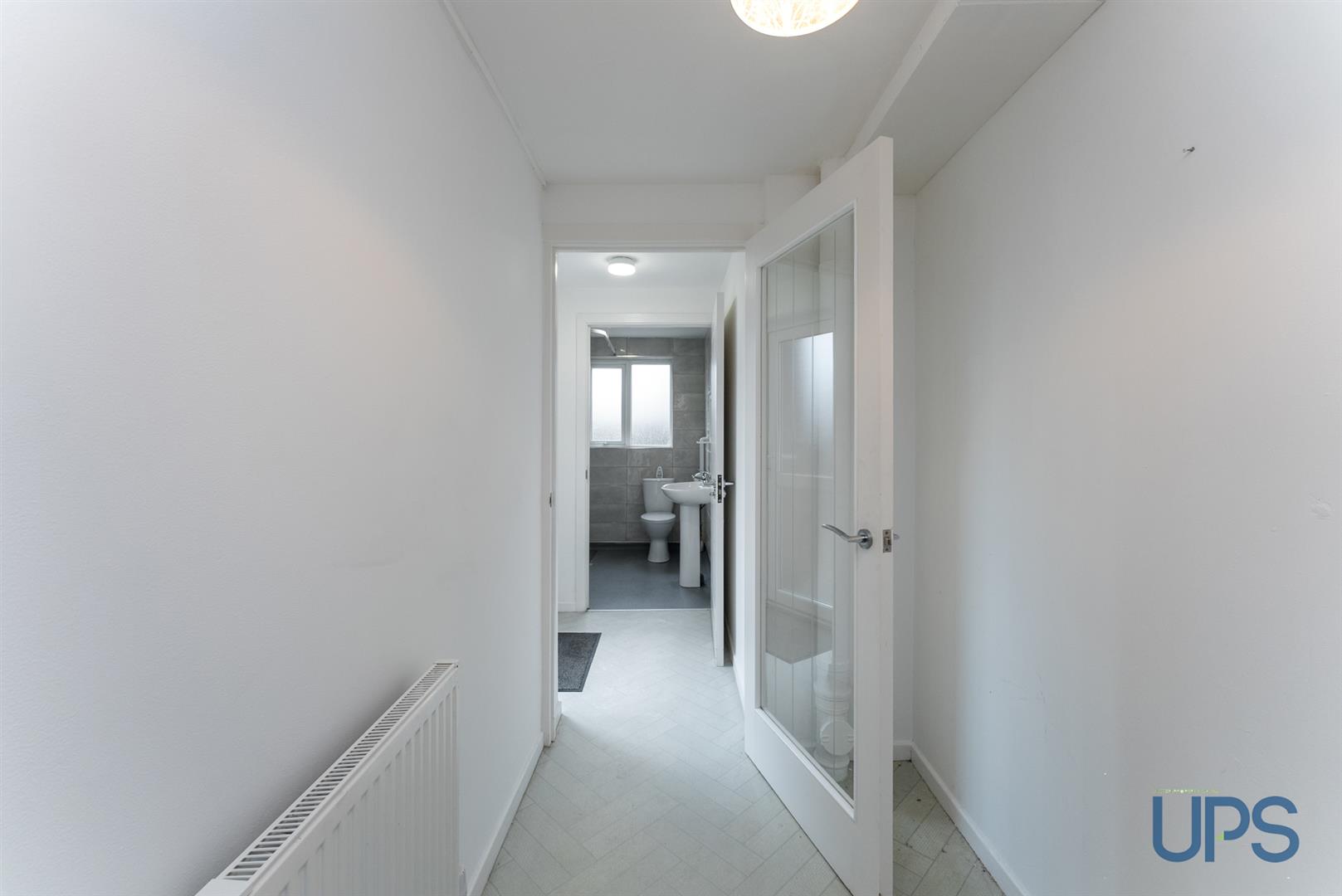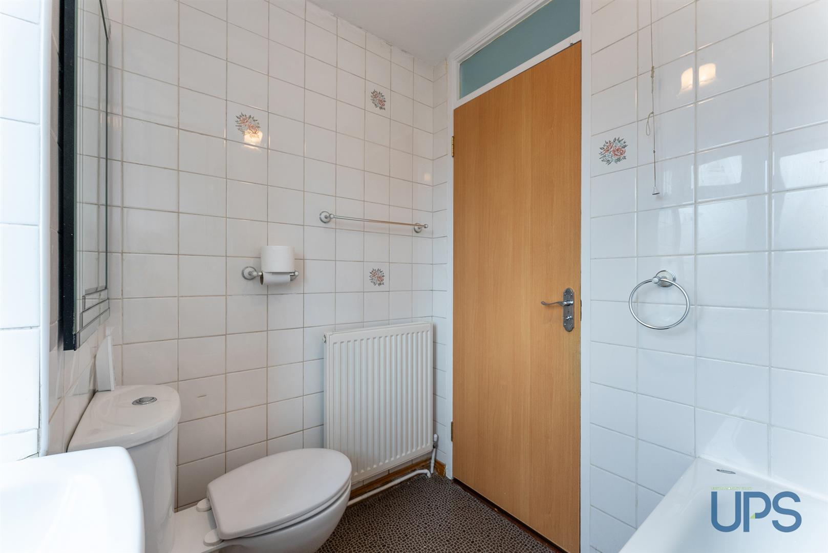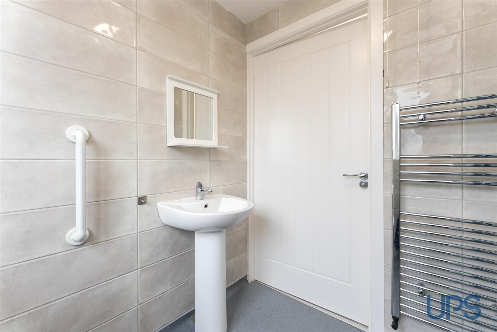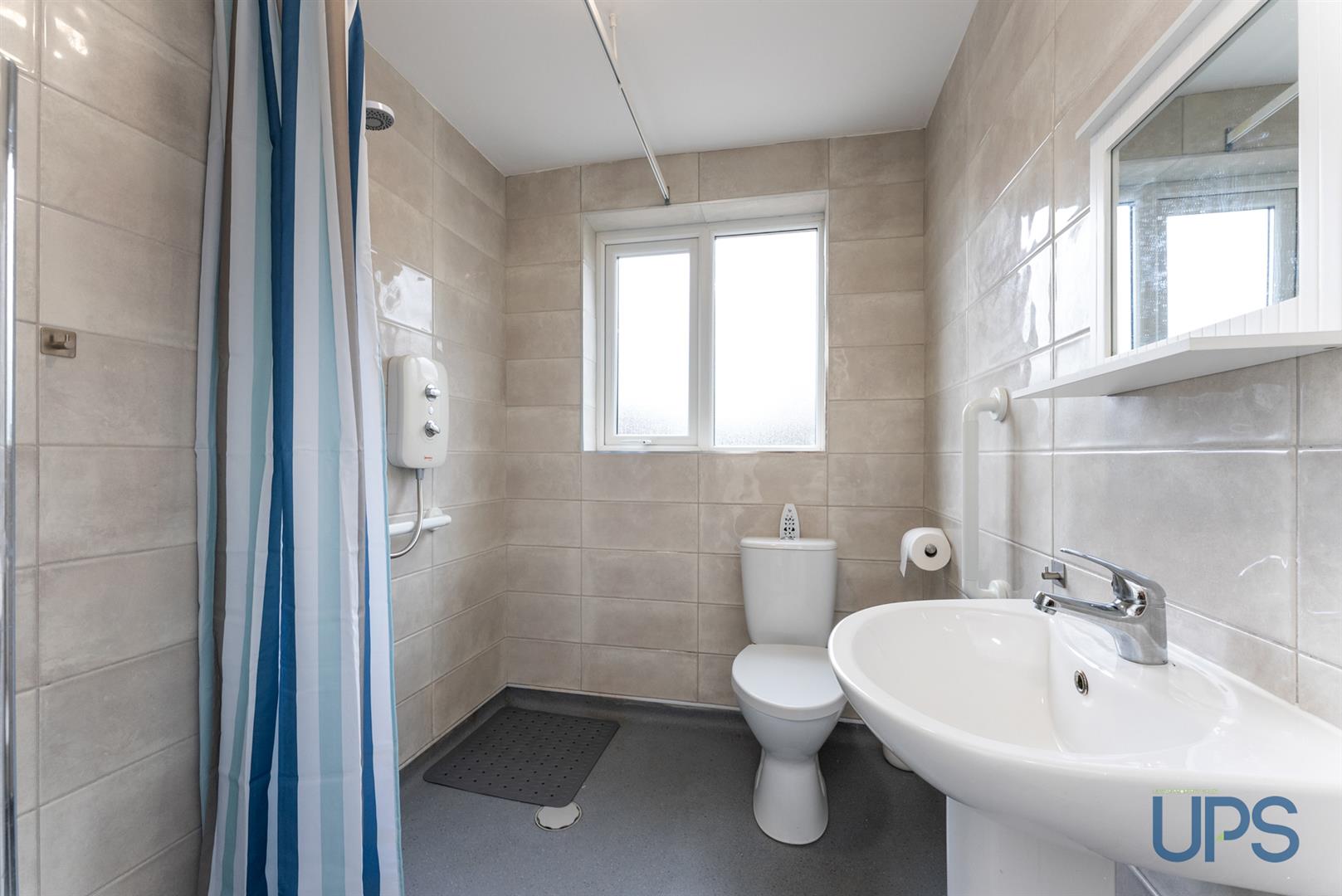 Fully tiled shower facility, electric shower unit, pedestal wash hand basin, low flush w.c, electric shower unit, chrome heated towel rail.