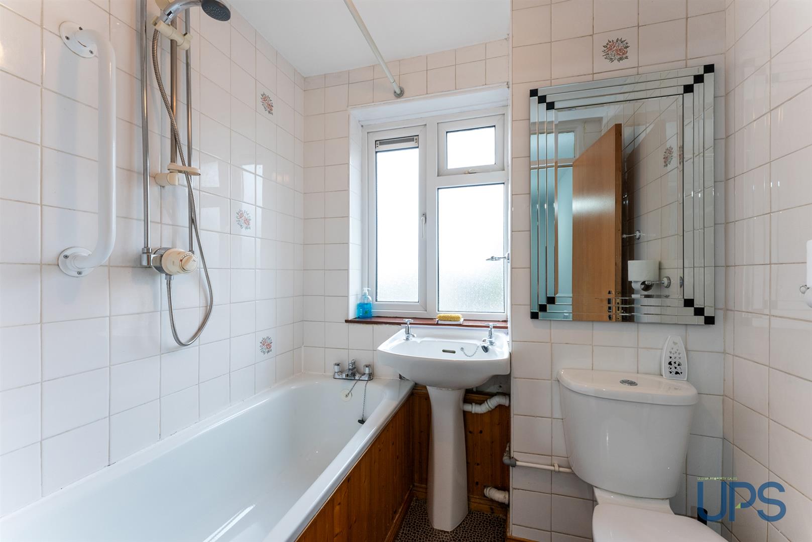 Panelled bath, pedestal wash hand basin, low flush w.c, tiling, thermostatically controlled shower unit.