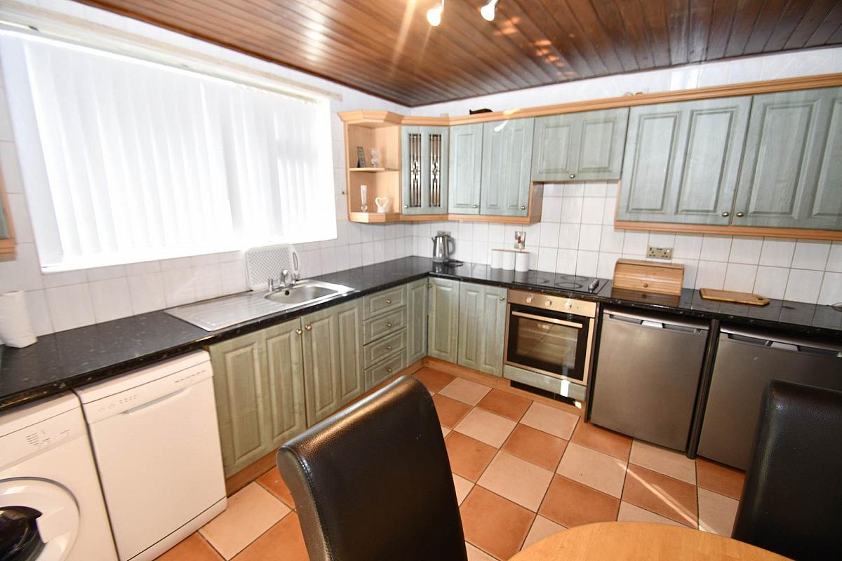 Fitted kitchen with a range of high and low level units, formica work surfaces, stainless steel sink drainer, ceramic hob with built in oven, plumbed for washing machine, space for a dishwasher, dining area, part tiled walls and ceramic tiled flooring.