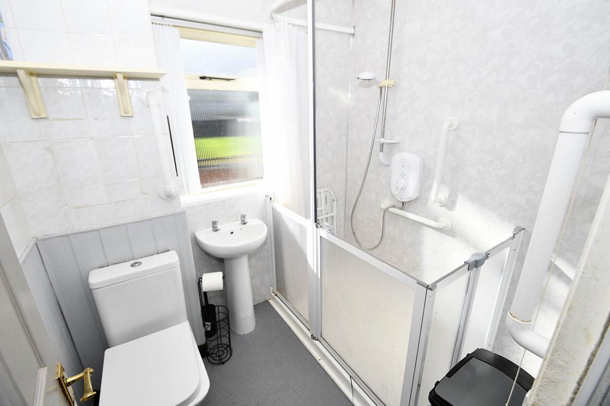 White suite comprising of access walk in shower with pedestal wash hand basin, low flush WC, part PVC walls, anti slip flooring.